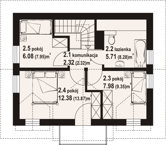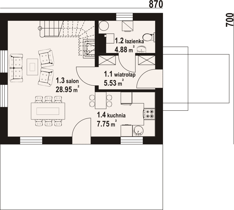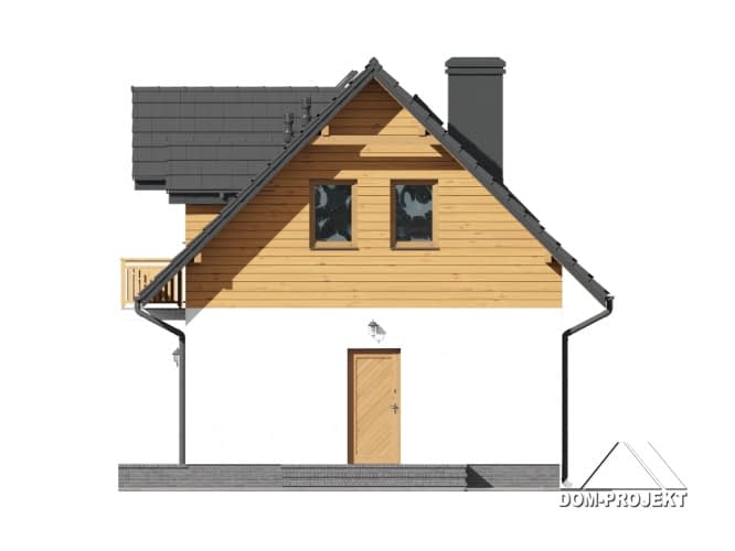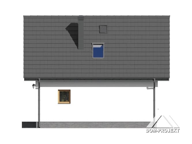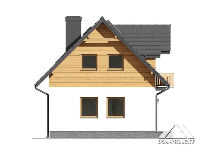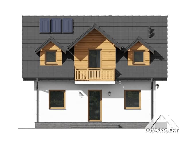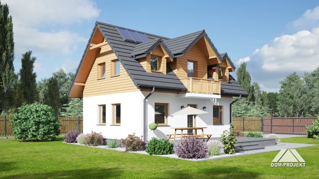 Dom z poddaszem użytkowym. Duży salon z aneksem kuchennym, kominkiem, wyjściem na taras i schodami na poddasze. Wiatrołap i łazienka.Na poddaszu trzy pokoje, łazienka i komunikacja. Zwarta bryła budynku i dach dwuspadowy sprzyjają szybkiej i taniej budowie i niskim kosztom eksploatacji.Rzuty
