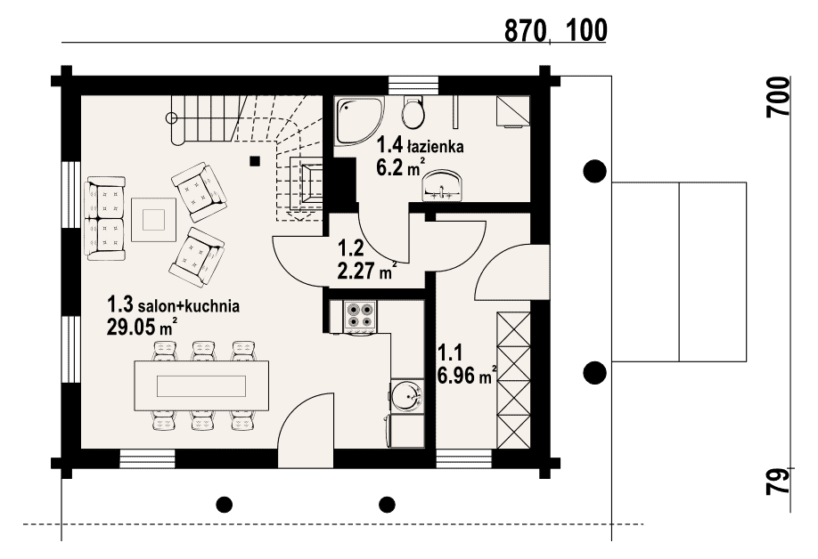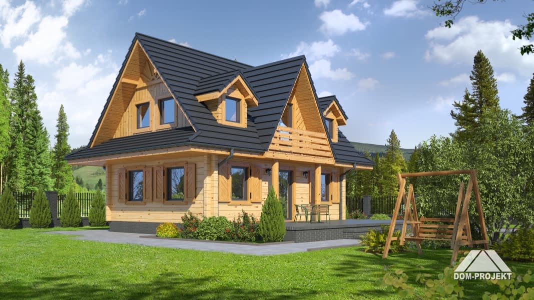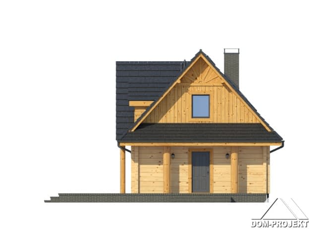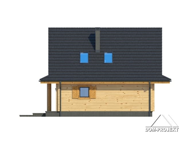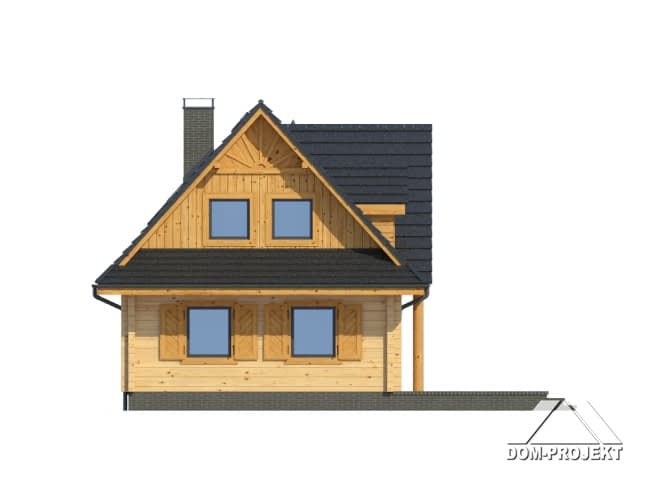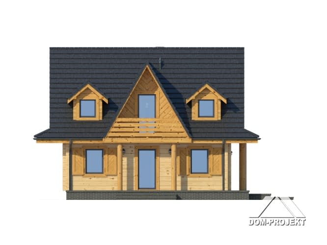 Nieduży, ekonomiczny dom z poddaszem, nadający się do usytuowania na wąskiej działce. Na parterze zaprojektowano salon z aneksem kuchennym oraz łazienkę. W salonie kominek i usytuowane w narożu schody prowadzące na poddasze. Tam strefa nocna z trzema sypialniami i łazienką.Rzuty