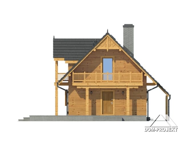 Dom w technologii szkieletu drewnianego. Duży salon z aneksem kuchennym, kominkiem, schodami na poddasze i wyjściem na taras. Łazienka z pralką, wiatrołap. Na poddaszu trzy pokoje, łazienka i komunikacja. Trzy balkony.Rzuty