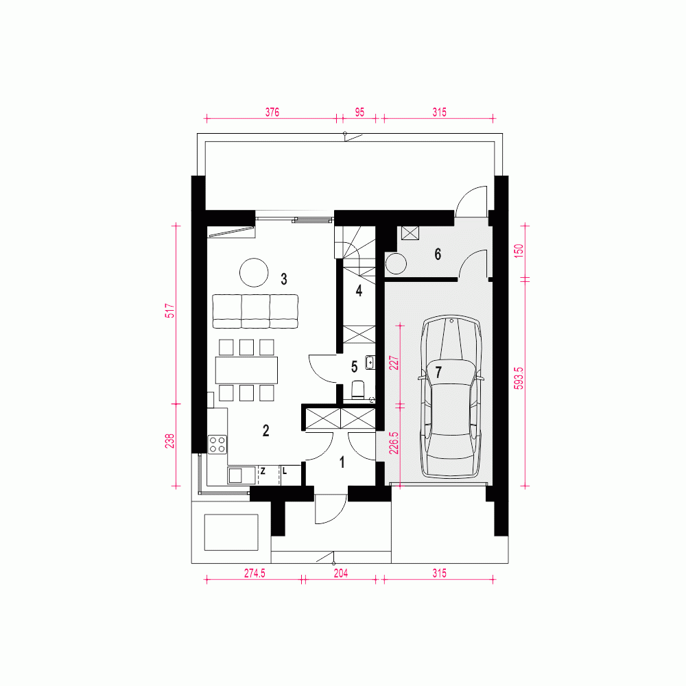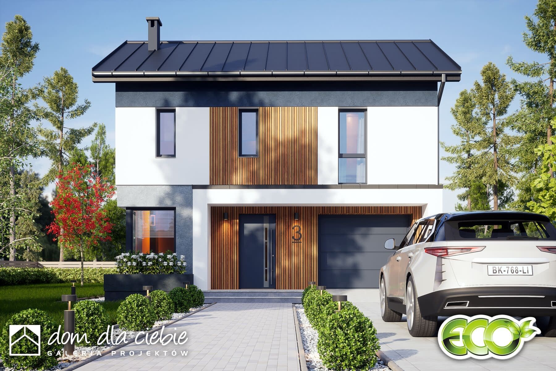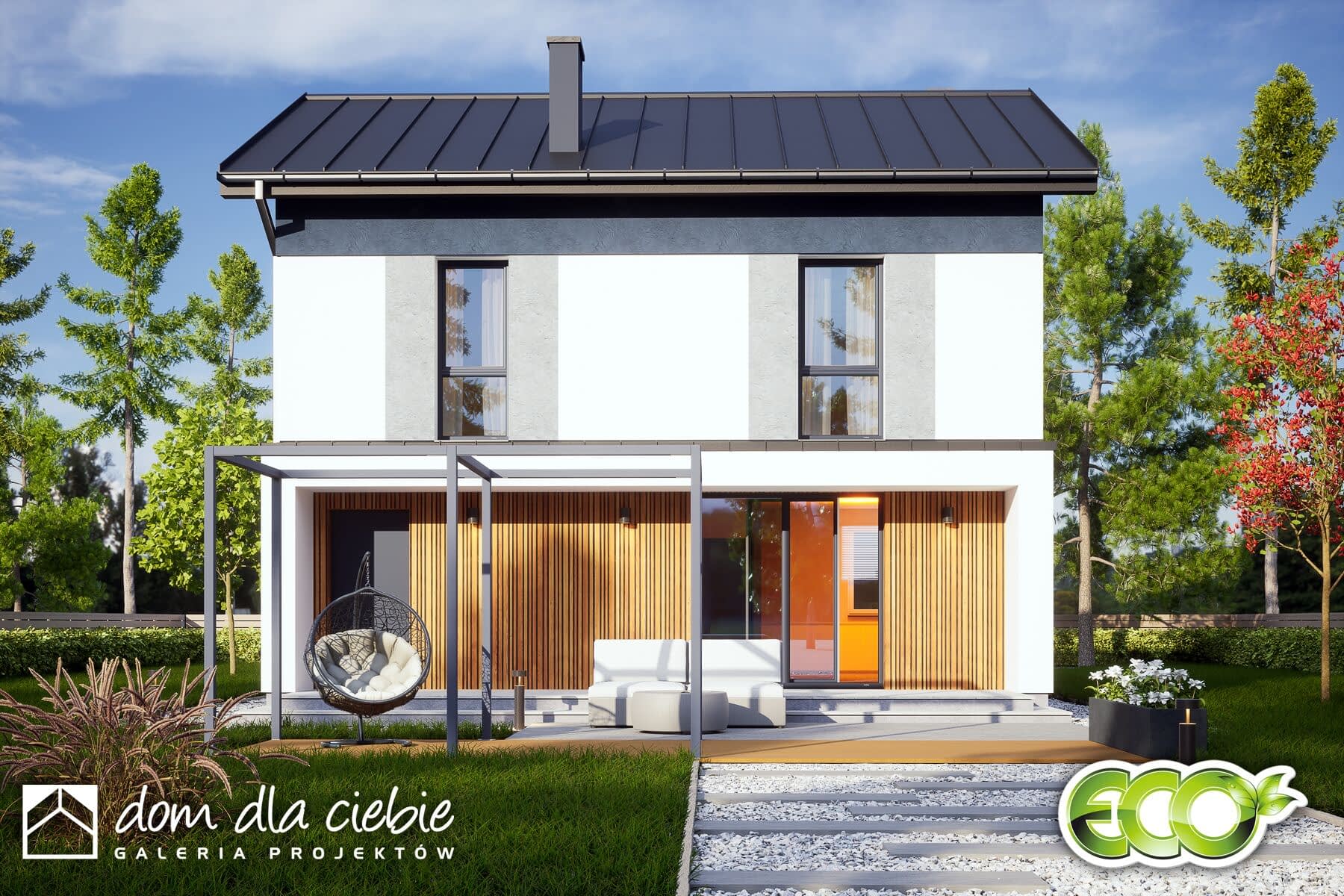 Projekt domu Gaja to nowoczesny piętrowy budynek z dwuspadowym dachem, idealny dla 4-osobowej rodziny. Parter obejmuje przestronny salon z jadalnią i otwartą kuchnią, wzbogacony dużymi drzwiami tarasowymi, które prowadzą na częściowo zadaszony taras. Kuchnia zyskała dodatkowe oświetlenie dzięki dużemu oknu narożnemu. Wejście do domu oraz wjazd do jednostanowiskowego garażu są osłonięte daszkiem. Na piętrze znajdują się trzy sypialnie, obszerna garderoba i funkcjonalna łazienka. Przechodnia kotłownia, dostępna z garażu, umożliwia wygodne wyjście do ogrodu. Konstrukcja dachu zaprojektowana jest z prefabrykowanych wiązach Mitek. Gaja to harmonijny, ponadczasowy dom o wyważonej estetyce, doskonały do miejskiej zabudowy.