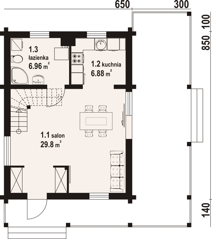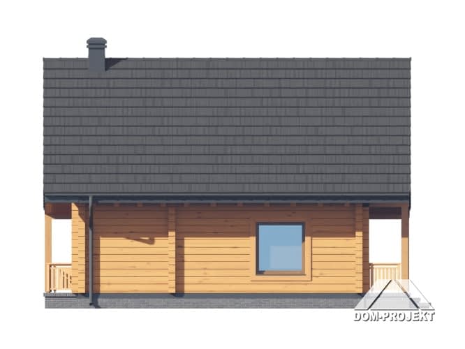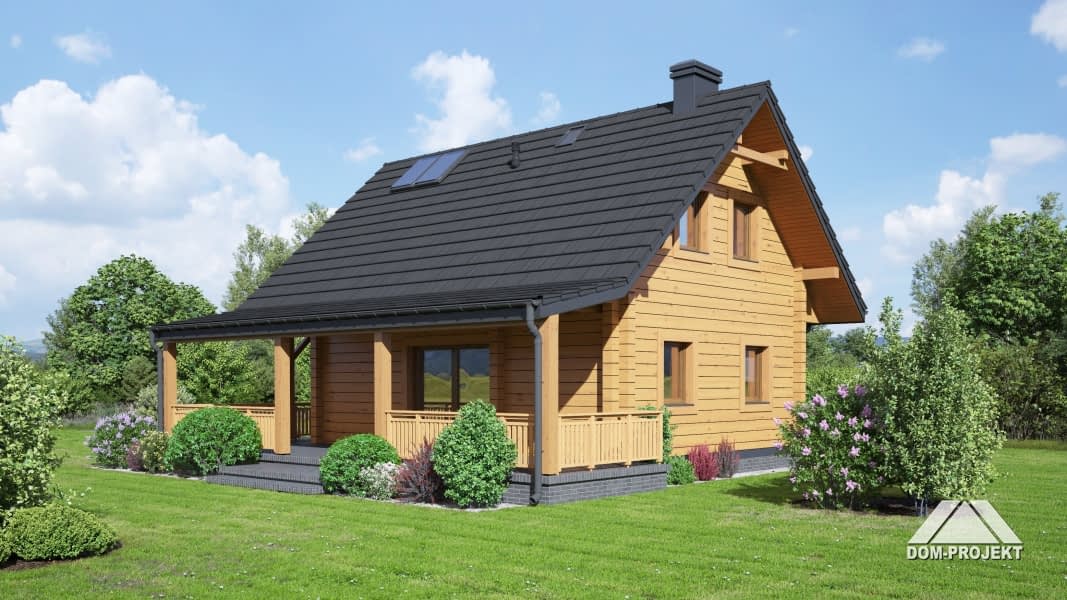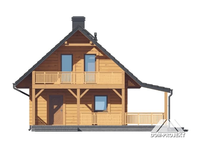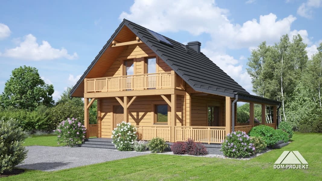 Dom z bali. Na parterze salon ze schodami na poddasze oraz wyjściem na duży, zadaszony taras. Kuchnia, łazienka. Na poddaszu dwa pokoje, wc, komunikacja oraz balkon. Zwarta bryła budynku oraz dach dwuspadowy sprzyjają szybkiej i taniej budowie oraz niskim kosztom eksploatacji.Rzuty
