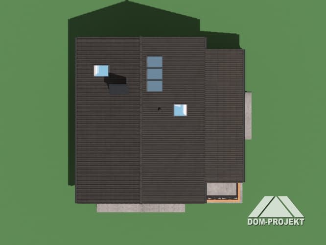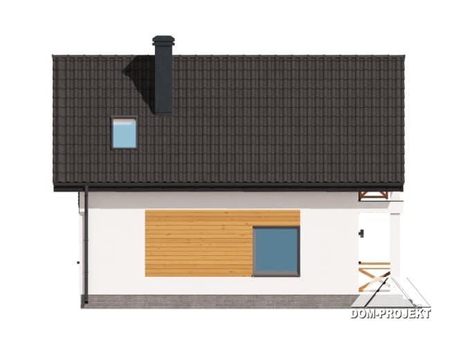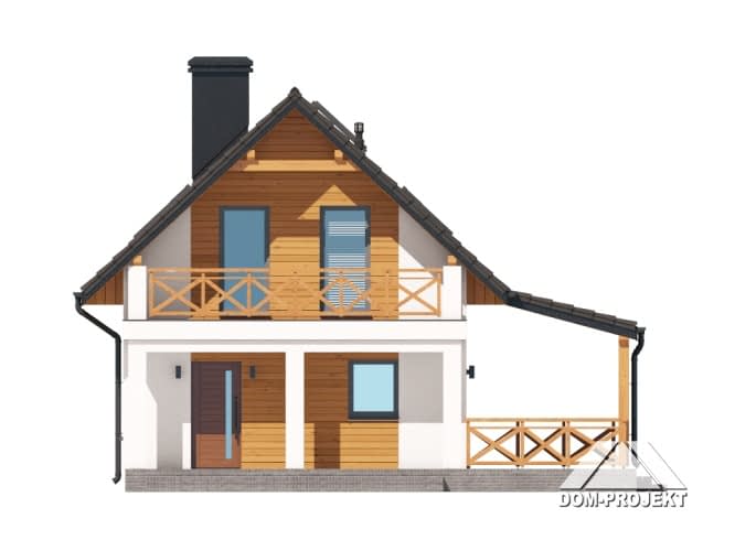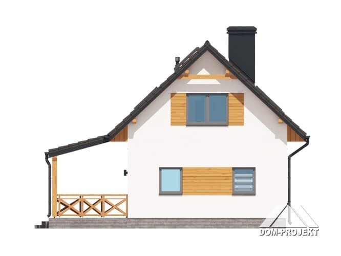 Dom z poddaszem użytkowym. Na parterze salon z kuchnią, kominkiem, wyjściem na duży, zadaszony taras i schodami na poddasze, łazienka. Na poddaszu trzy pokoje, komunikacja, łazienka. Zwarta bryła budynku oraz dach dwuspadowy sprzyjają szybkiej i taniej budowie oraz niskim kosztom eksploatacji.Rzuty
