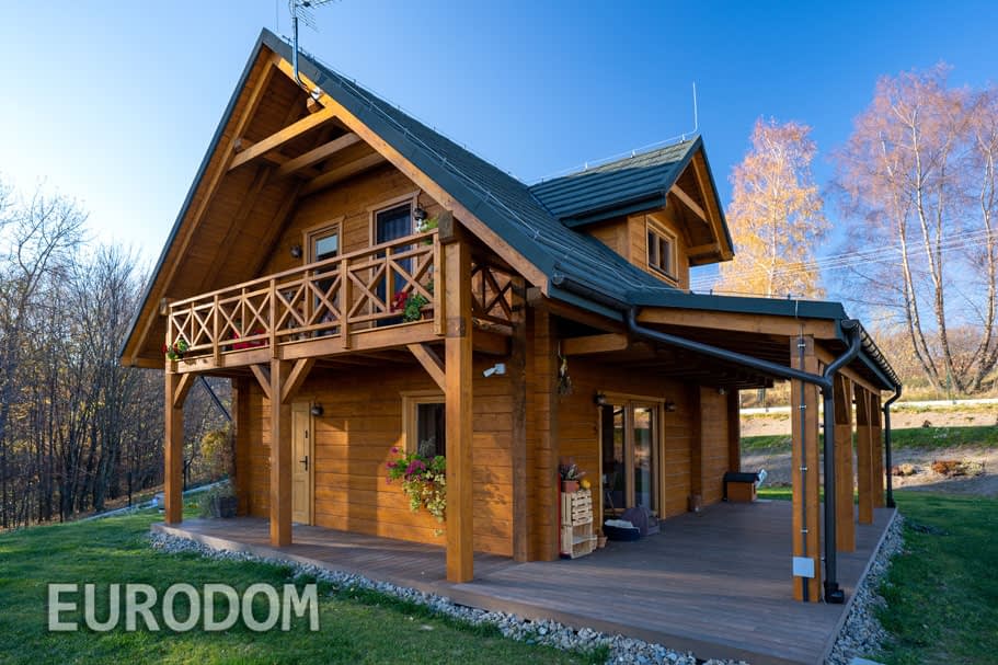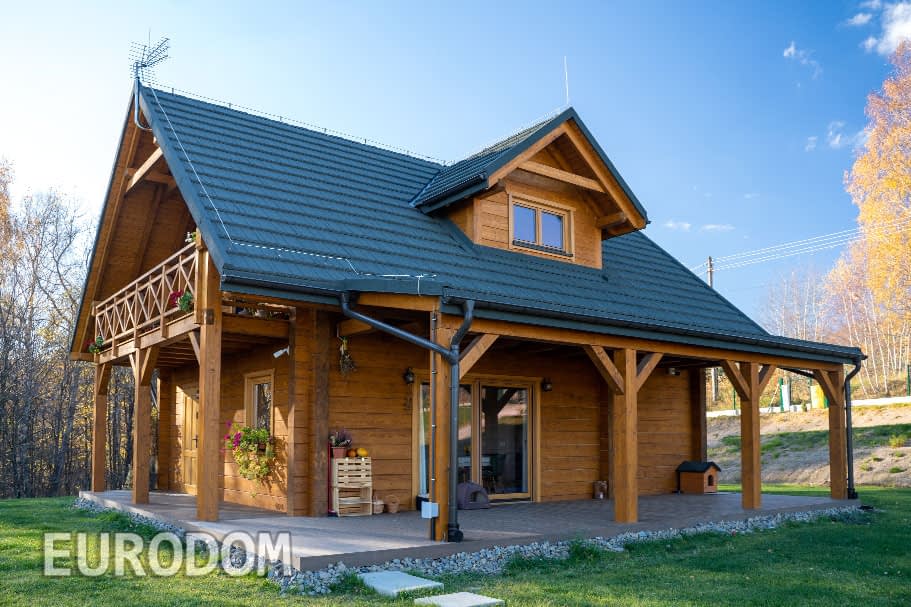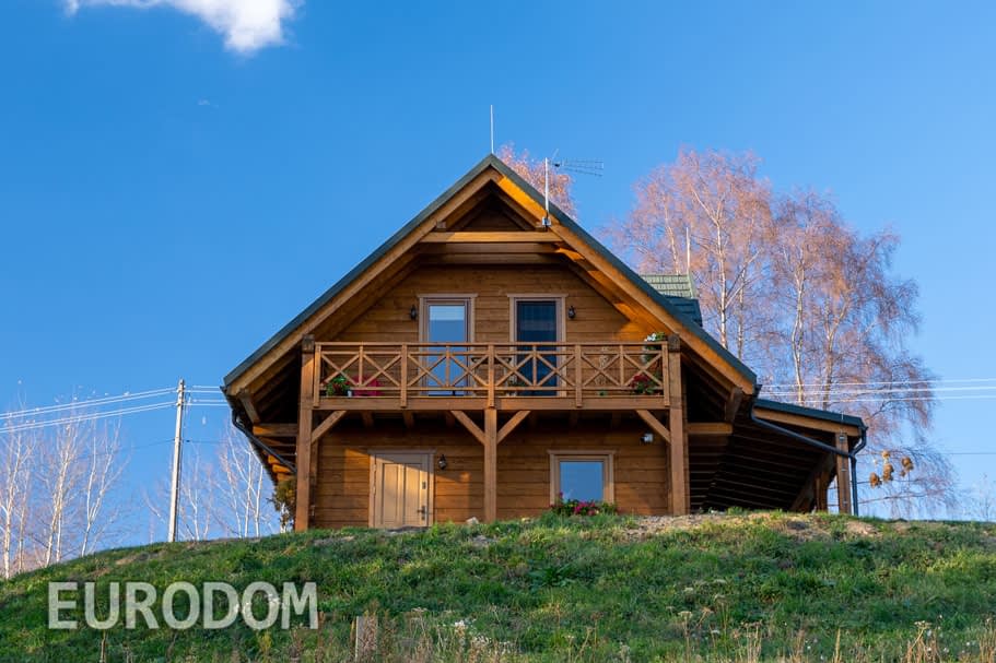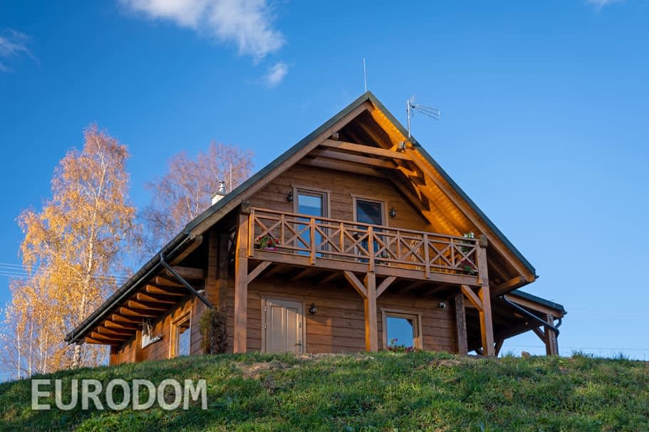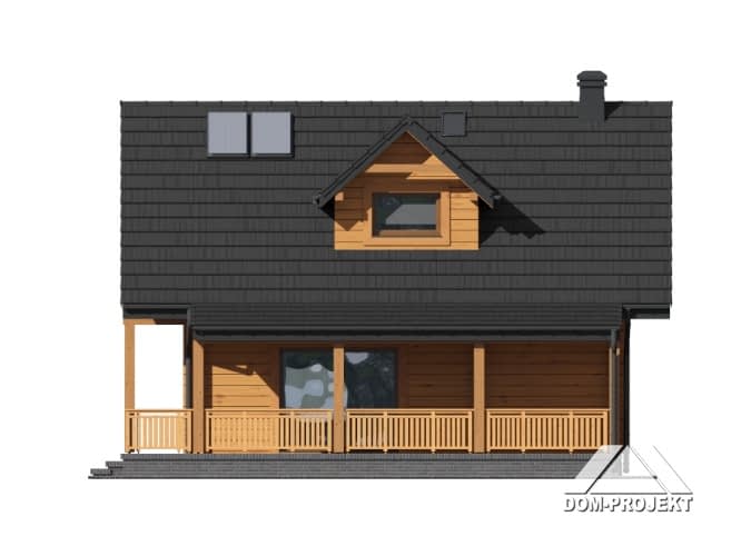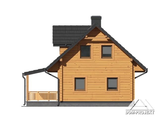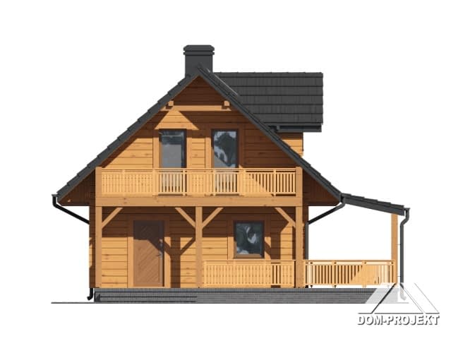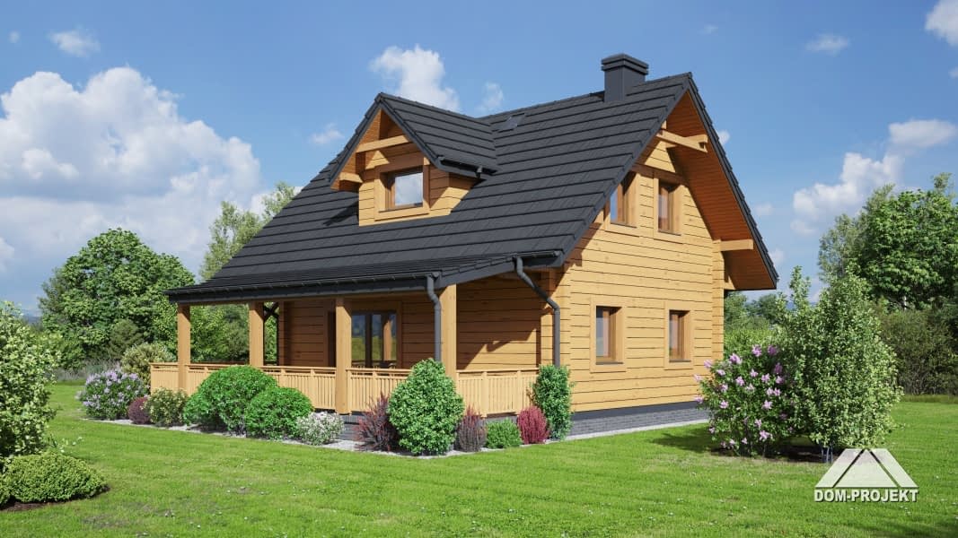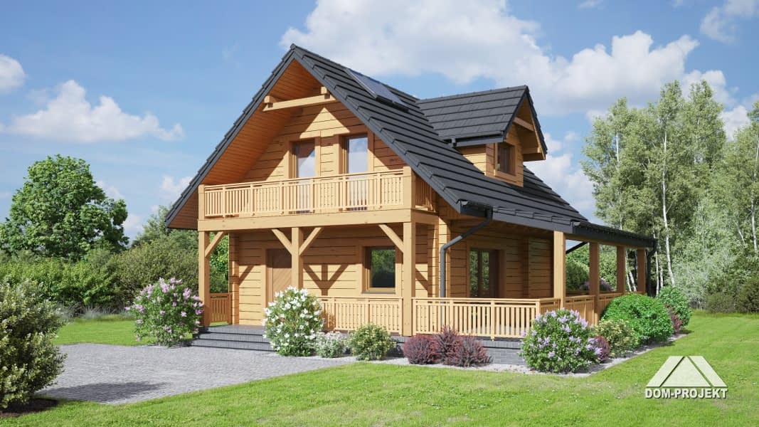 Całoroczny dom z bali. Duży salon z aneksem kuchennym i wyjściem na zadaszony taras. Łazienka i schody na poddasze. Na poddaszu trzy sypialnie, komunikacja i balkon. Zwarta bryła budynku i dach dwuspadowy sprzyjają szybkiej i taniej budowie i niskim kosztom eksploatacji.Rzuty