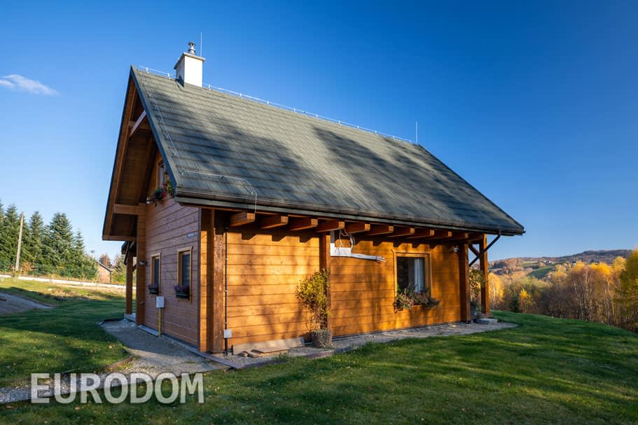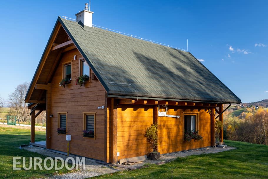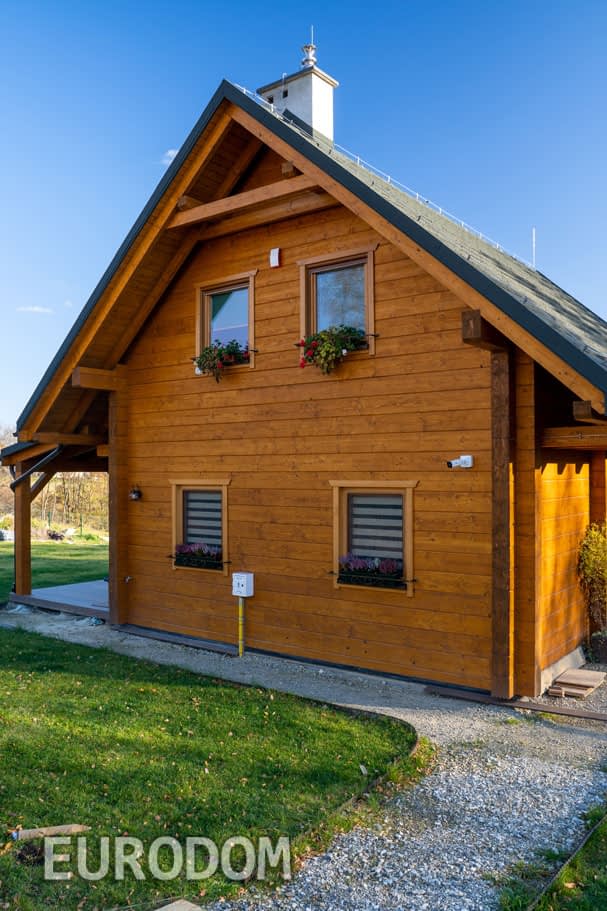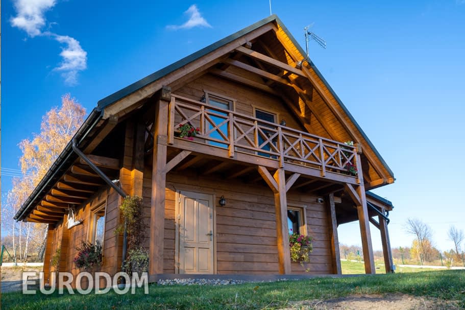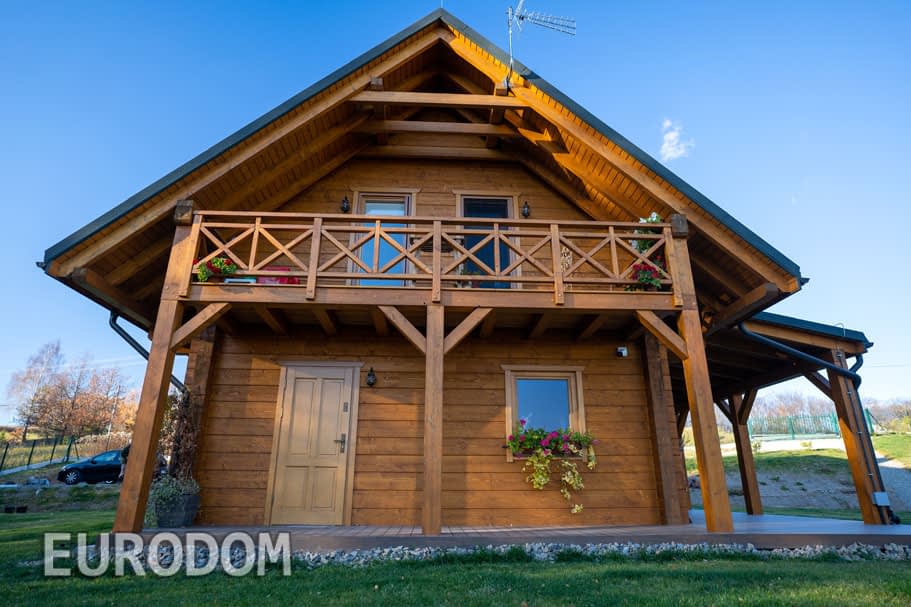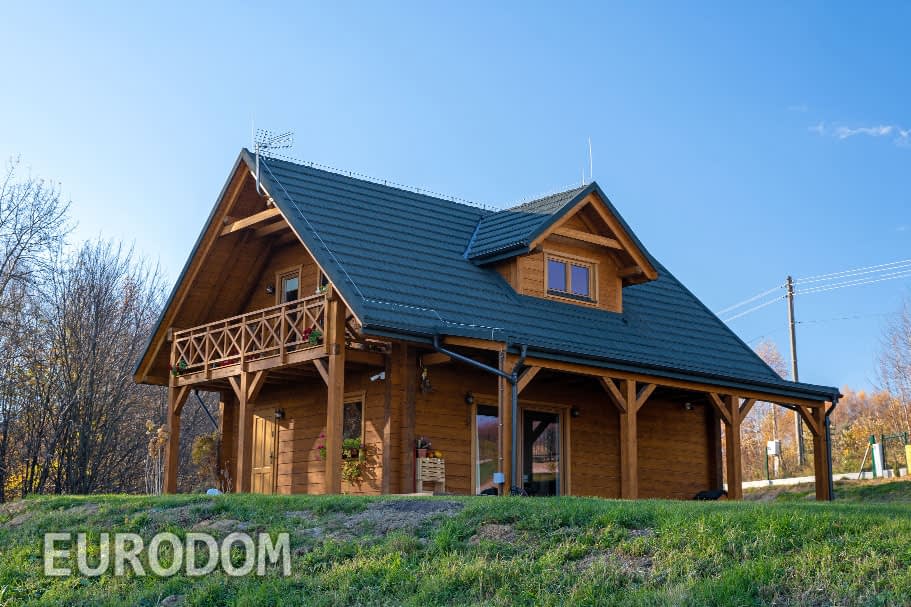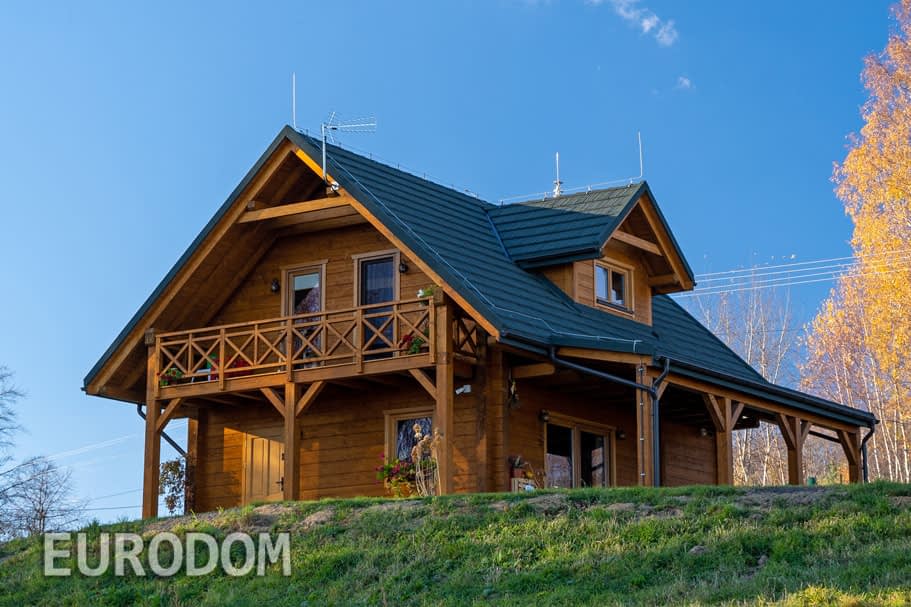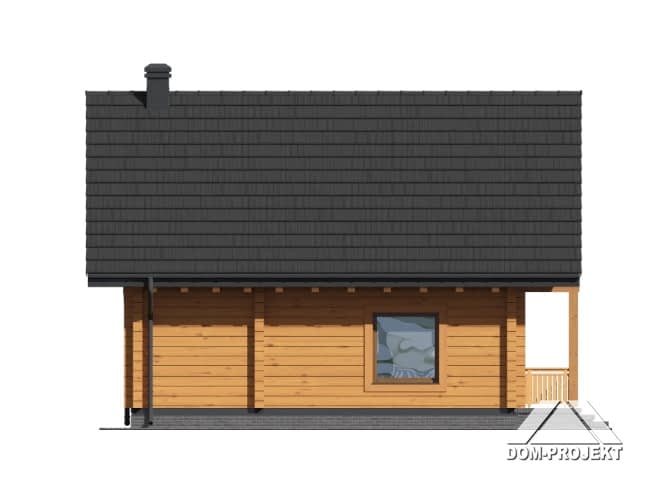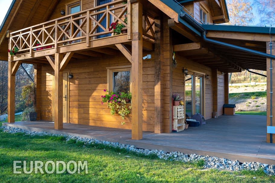 Całoroczny dom z bali. Duży salon z aneksem kuchennym i wyjściem na zadaszony taras. Łazienka i schody na poddasze. Na poddaszu trzy sypialnie, komunikacja i balkon. Zwarta bryła budynku i dach dwuspadowy sprzyjają szybkiej i taniej budowie i niskim kosztom eksploatacji.Rzuty