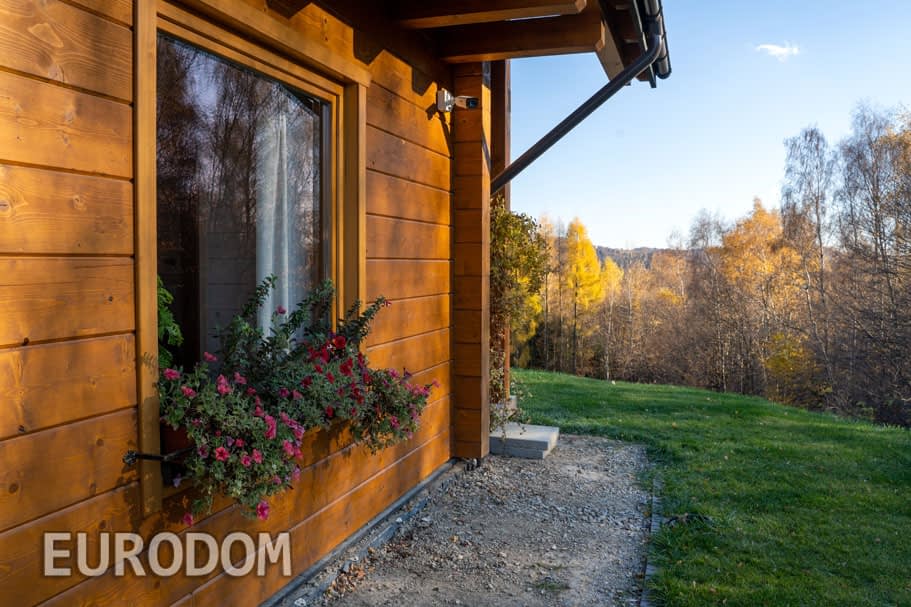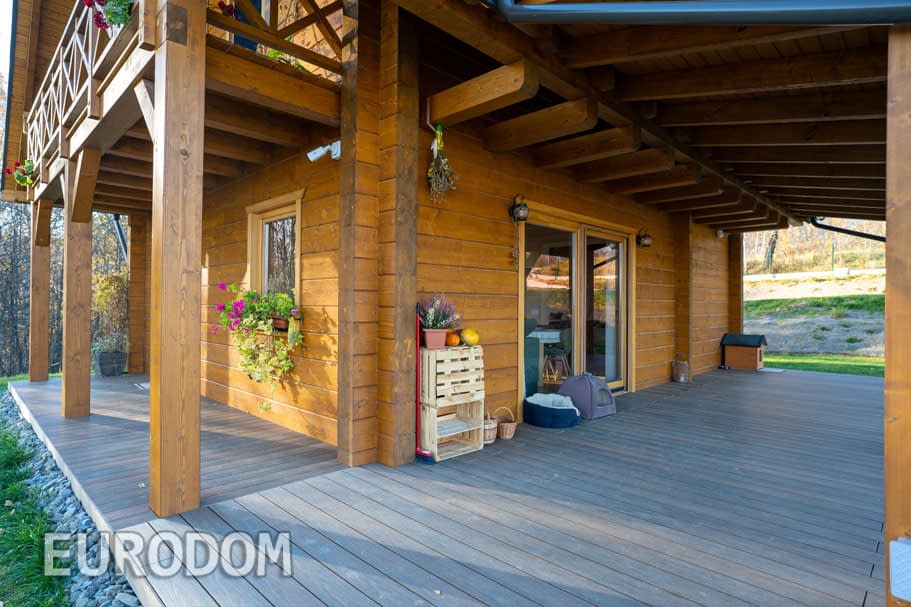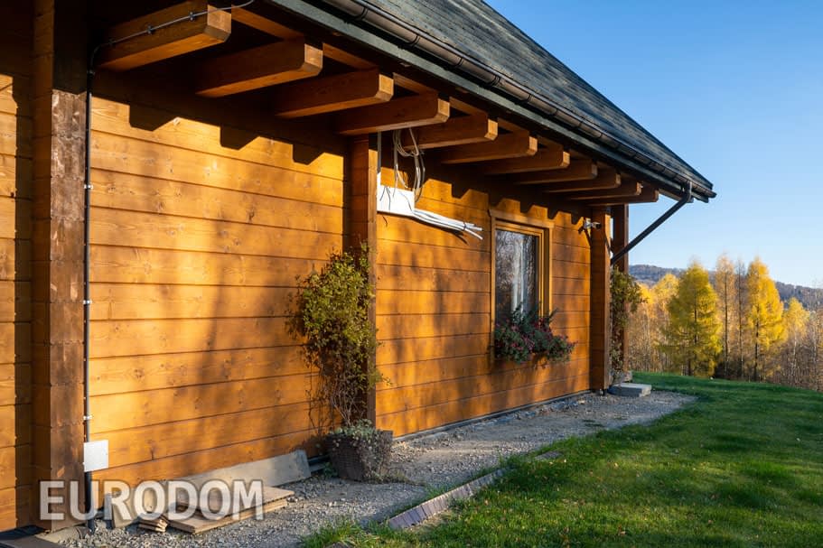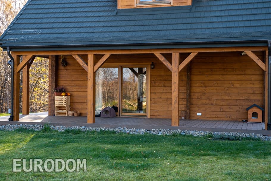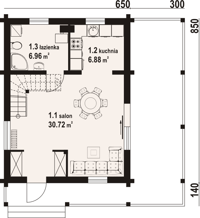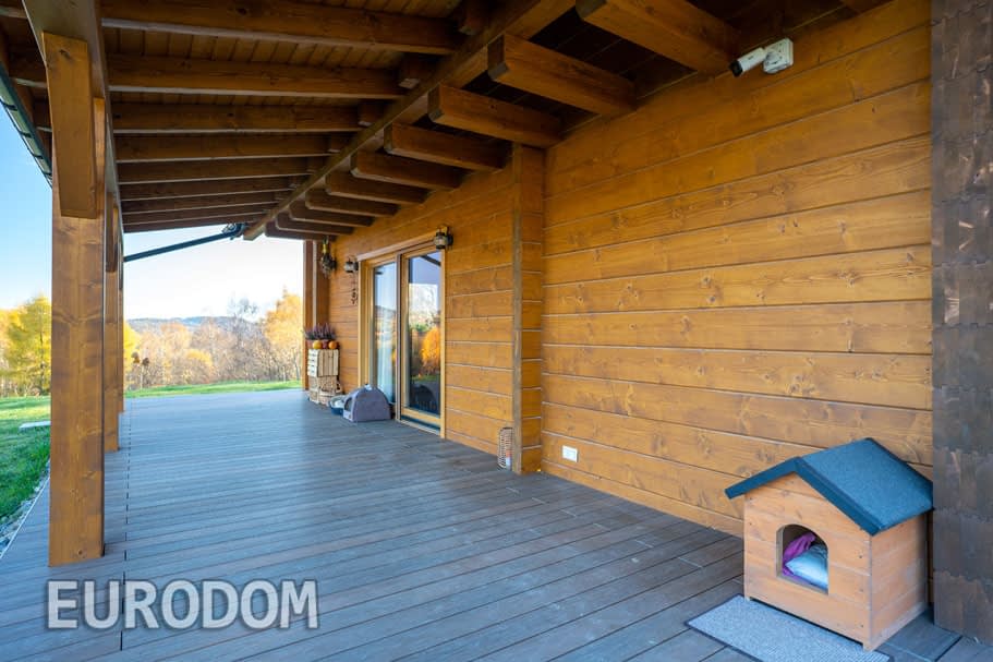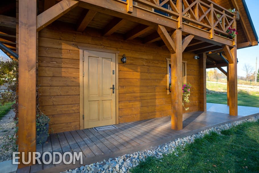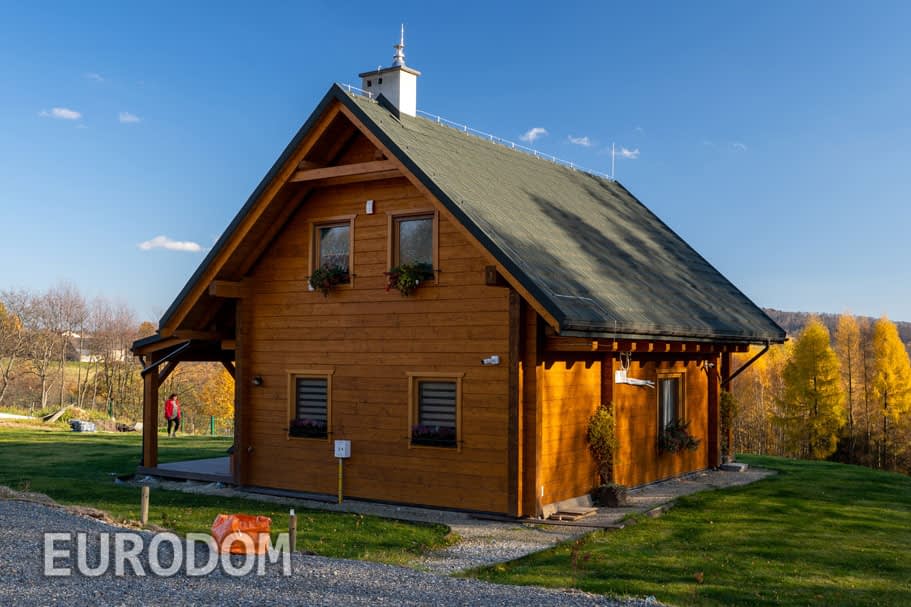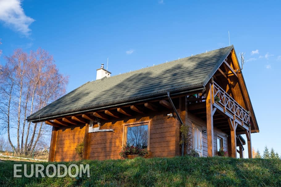 Całoroczny dom z bali. Duży salon z aneksem kuchennym i wyjściem na zadaszony taras. Łazienka i schody na poddasze. Na poddaszu trzy sypialnie, komunikacja i balkon. Zwarta bryła budynku i dach dwuspadowy sprzyjają szybkiej i taniej budowie i niskim kosztom eksploatacji.Rzuty