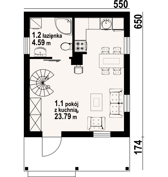 Mały letniskowy dom w konstrukcji szkieletu drewnianego. Na parterze pokój z aneksem kuchennym, łazienką i schodami na poddasze. Na poddaszu sypialnia z dostępnym balkonem oraz wc.Rzuty