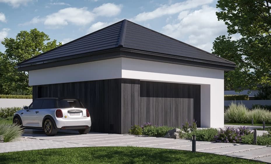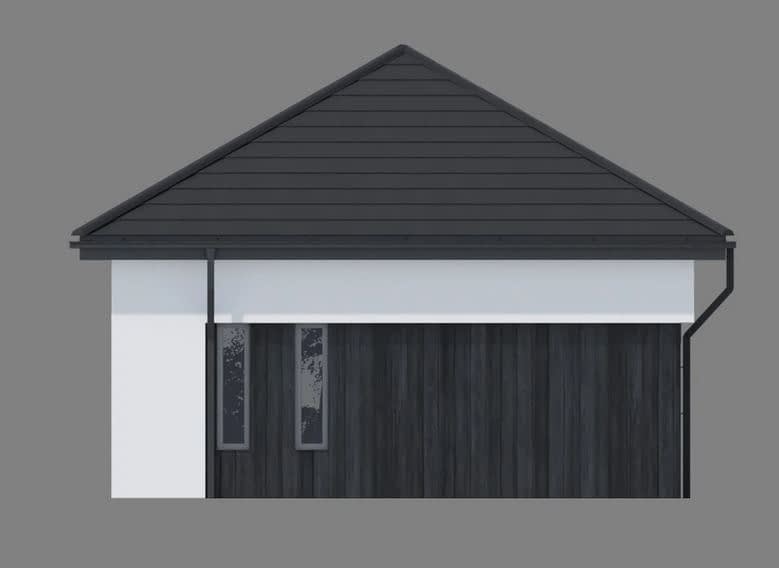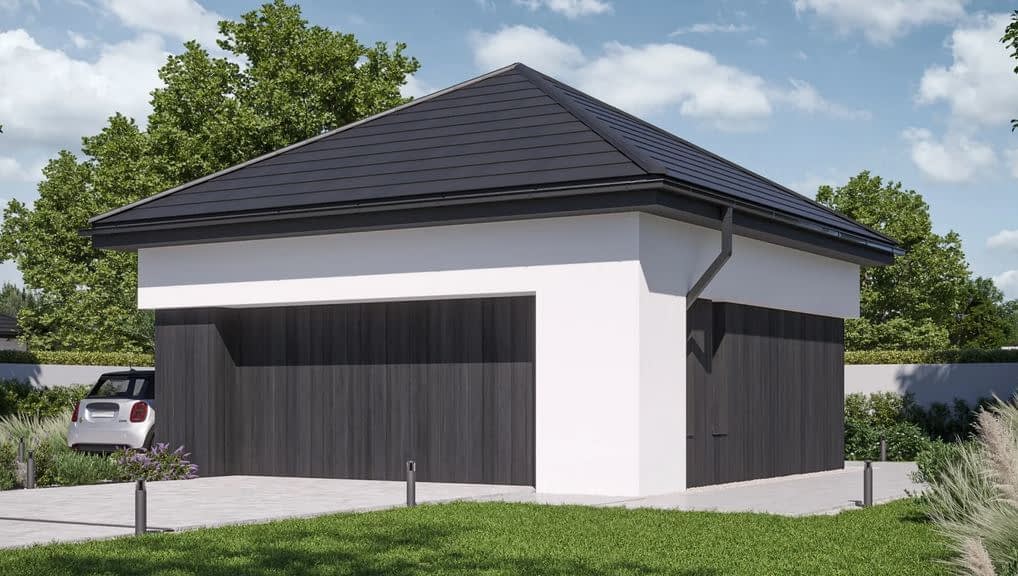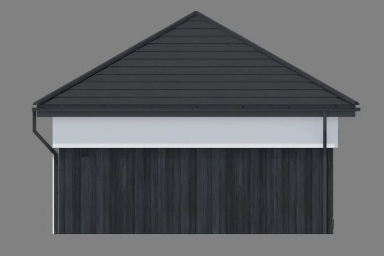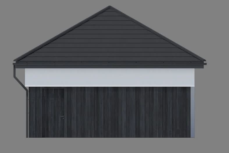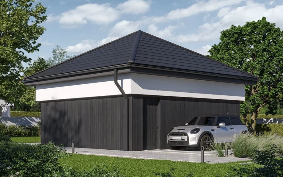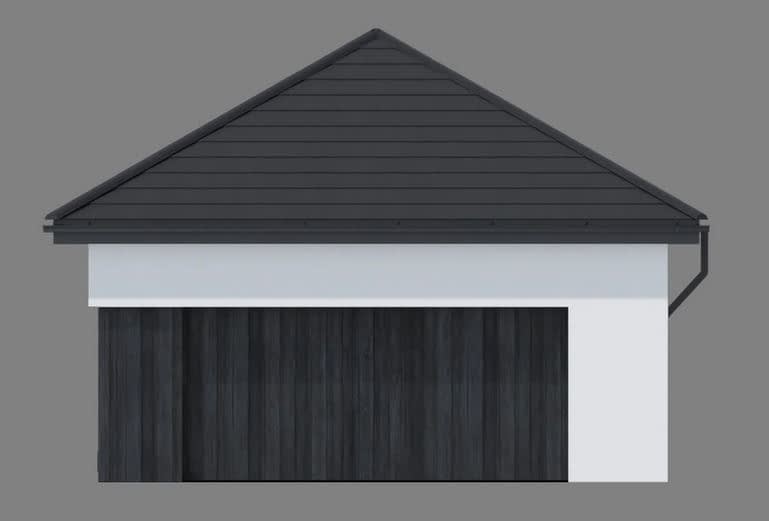 Gotowy projekt garażu dwustanowiskowego Garage 03. Propozycja dla osób, które szukają lokum dla swoich dwóch aut. Bryła budynku przykryta jest dachem kopertowym. Garaż doświetlony jest dwoma wąskimi oknami a po ich przeciwnej stronie, na bocznej elewacji znajdują się standardowe drzwi wejściowe, ułatwiające komunikację z garażem bez konieczności otwierania bramy garażowej.