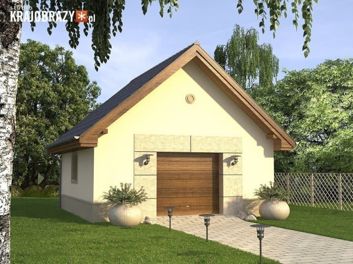 Budynek garażu niepodpiwniczony, parterowy. Mieści się w nim jeden samochód osobowy oraz dużo szaf i przestrzeni odkładczej. Możliwe wykonanie stropu i zagospodarowanie uzyskanego w ten sposób poddasza na dodatkowe pomieszczenie magazynowe lub inne. Dokumentacja dostępna również w odbiciu lustrzanym. Propozycja garażu z dachem dwuspadowym i jedną bramą uchylną. Budynek o klasycznym wystroju z wjazdem w ścianie szczytowej ozdobiony ramą z okładziny kamiennej i wyodrębnionym kolorystycznie cokołem.Rzuty