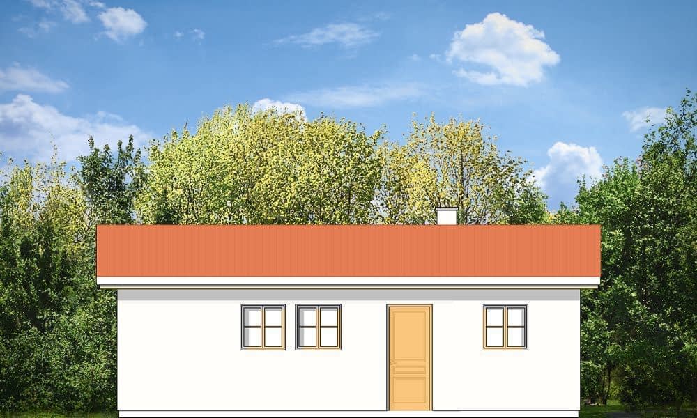 Garaż jednostanowiskowy z pomieszczeniem gospodarczym z tyłu (dostępny również jako budynek gospodarczy) przykryty dachem dwuspadowym z dodatkowym wyjściem od strony elewacji bocznej.