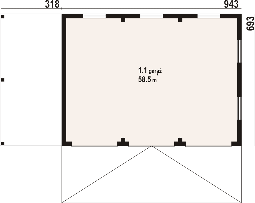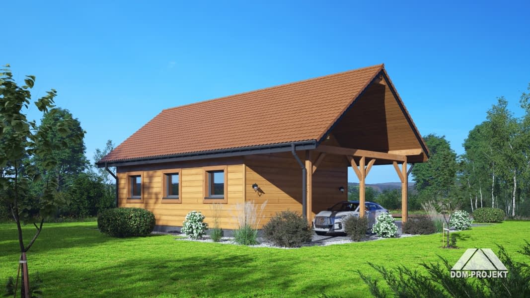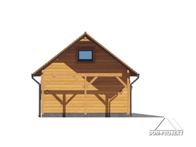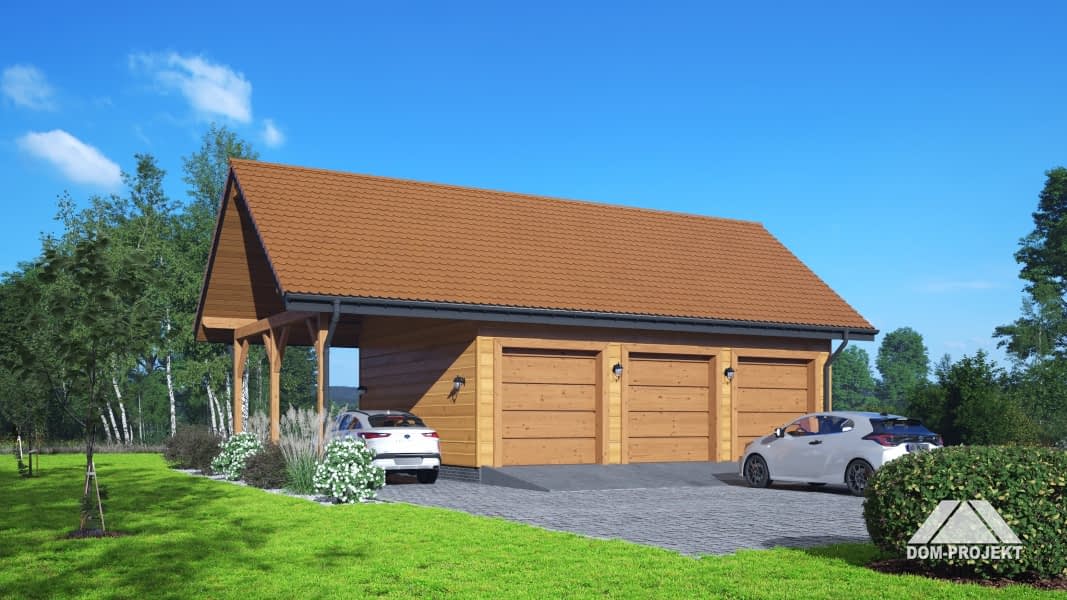 Garaż na trzy samochody z dodatkową wiatą. Wejście na strych schodami strychowymi rozkładanymi.Rzuty