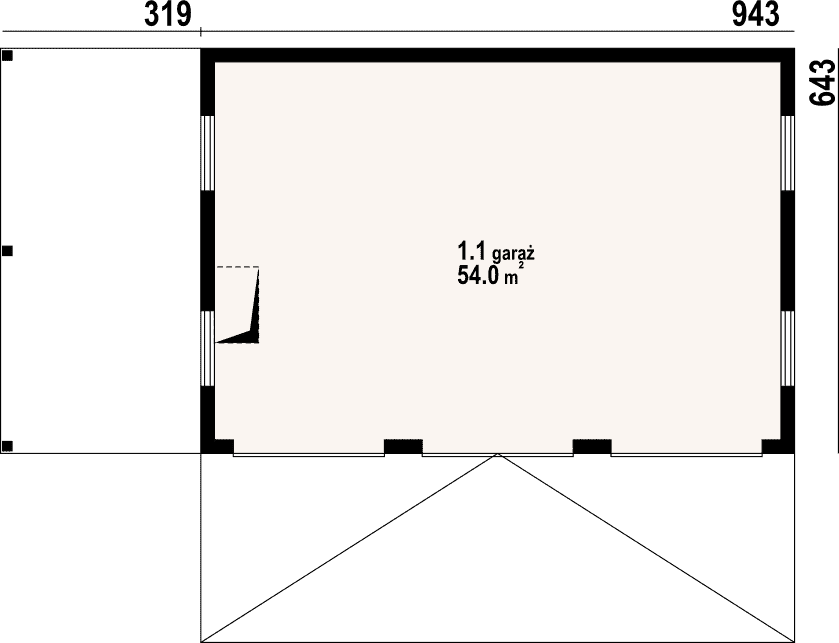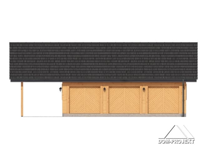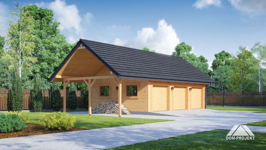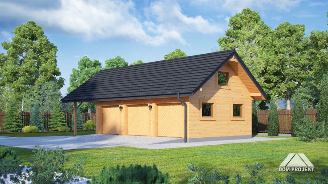 Garaż na trzy samochody i wiata garażowa. Konstrukcja budynku - szkielet drewniany. Poddasze nieużytkowe.Rzuty