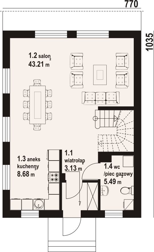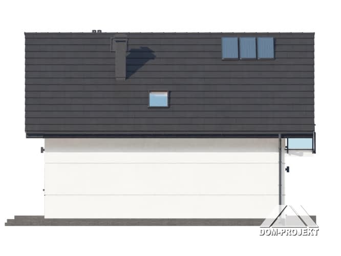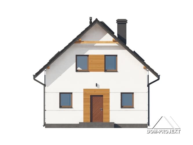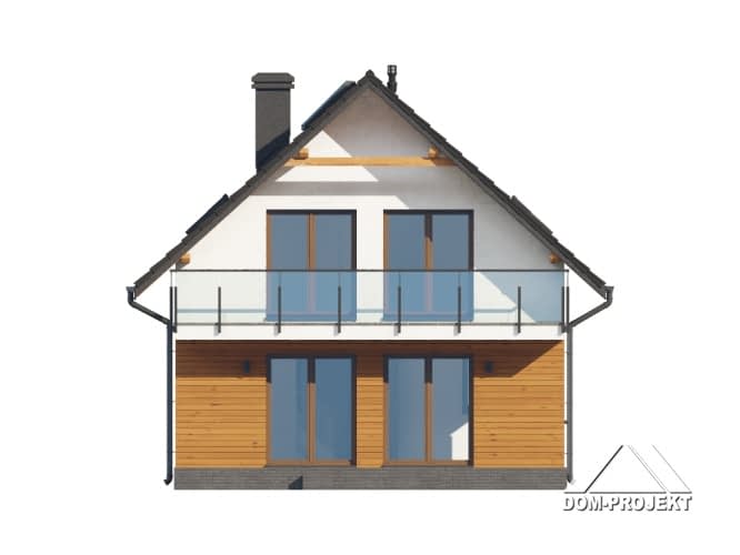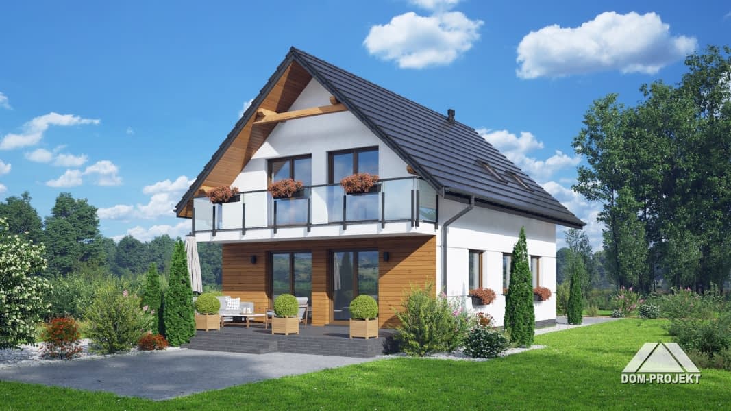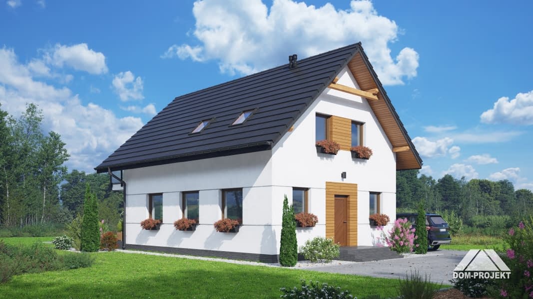 Dom z poddaszem użytkowym. Na parterze salon z aneksem kuchennym oraz wyjściem na taras. Wiatrołap, wc z piecem gazowym. Na poddaszu trzy pokoje, łazienka, garderoba, komunikacja oraz balkon dostępny z dwóch pokoi. Zwarta bryła budynku oraz dach dwuspadowy sprzyjają szybkiej i taniej budowie oraz niskim kosztom eksploatacji.Rzuty