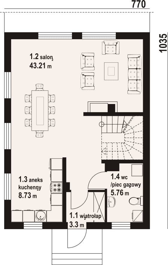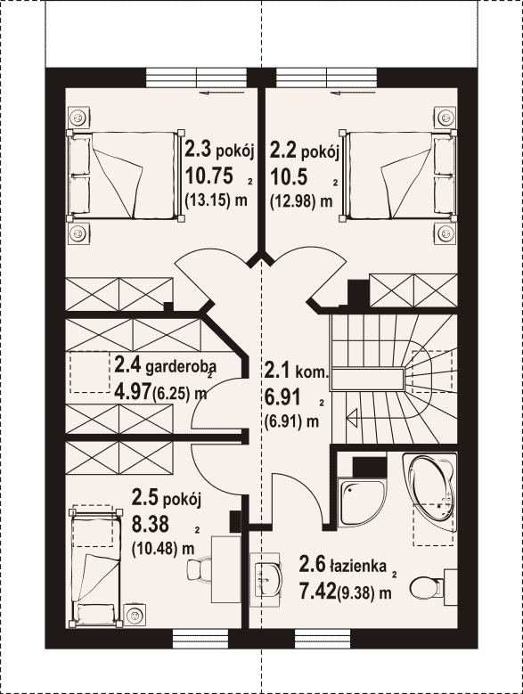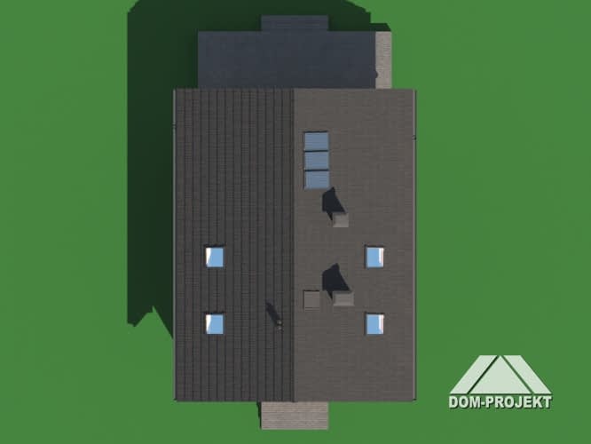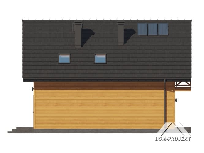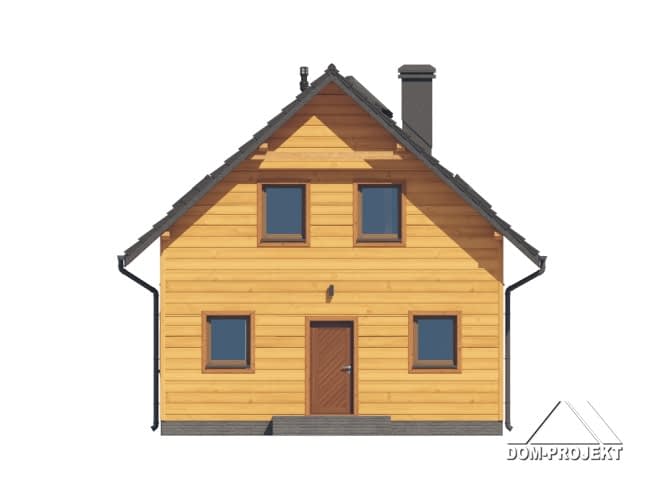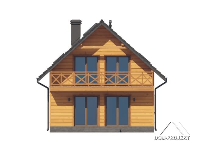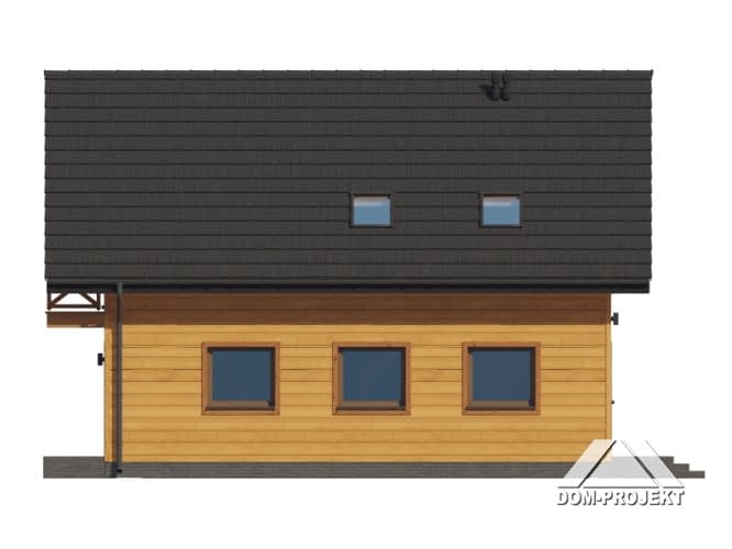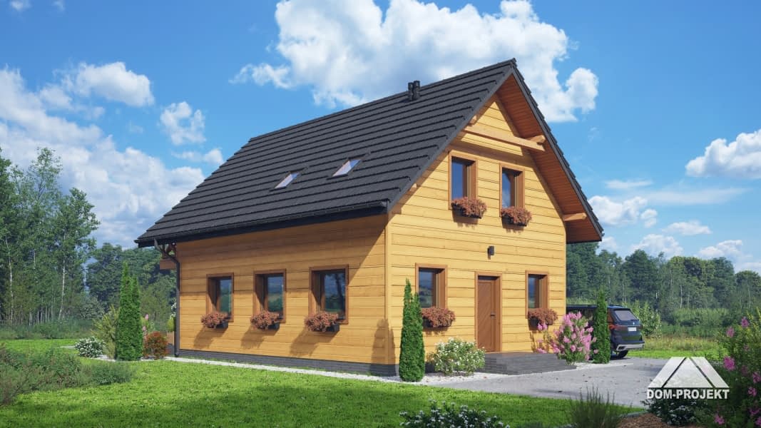 Dom w konstrukcji szkieletu drewnianego. Na parterze salon z aneksem kuchennym oraz wyjściem na taras. Wc z piecem gazowym, wiatrołap. Na poddaszu trzy pokoje, garderoba, łazienka, komunikacja oraz balkon dostępny z dwóch pokoi. Zwarta bryła budynku oraz dach dwuspadowy sprzyjają szybkiej i taniej budowie oraz niskim kosztom eksploatacji.Rzuty