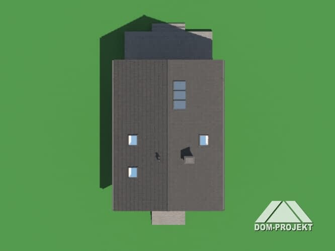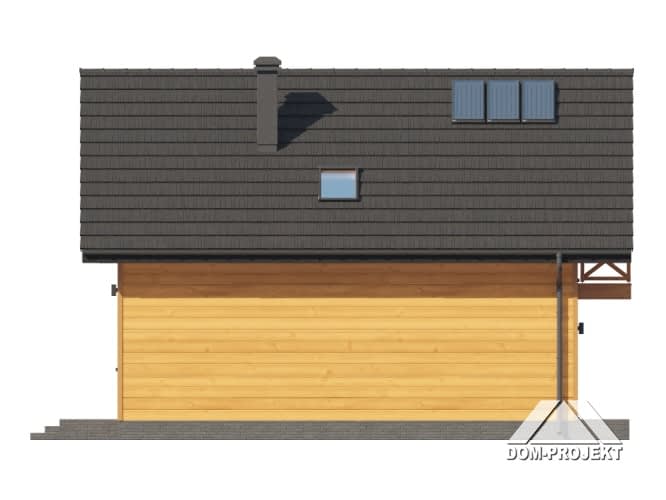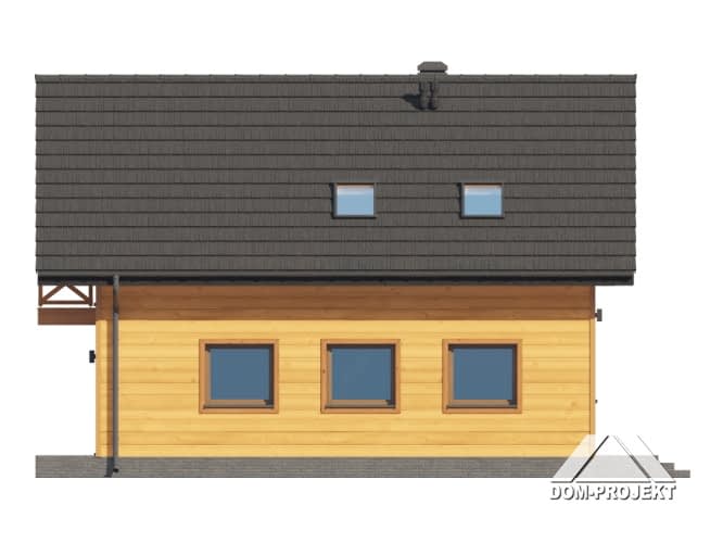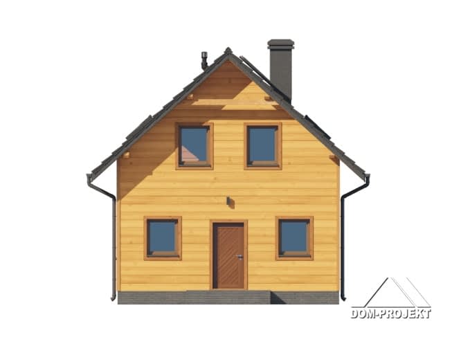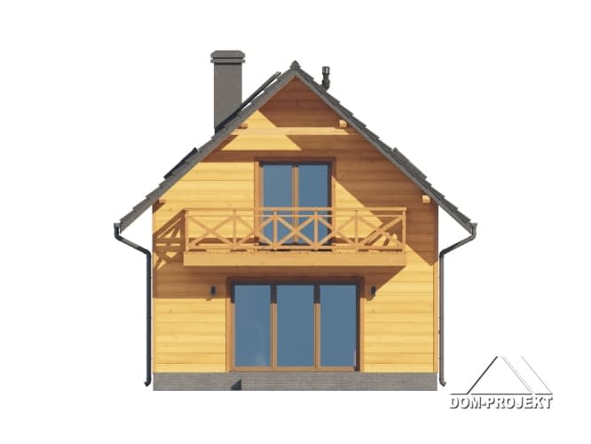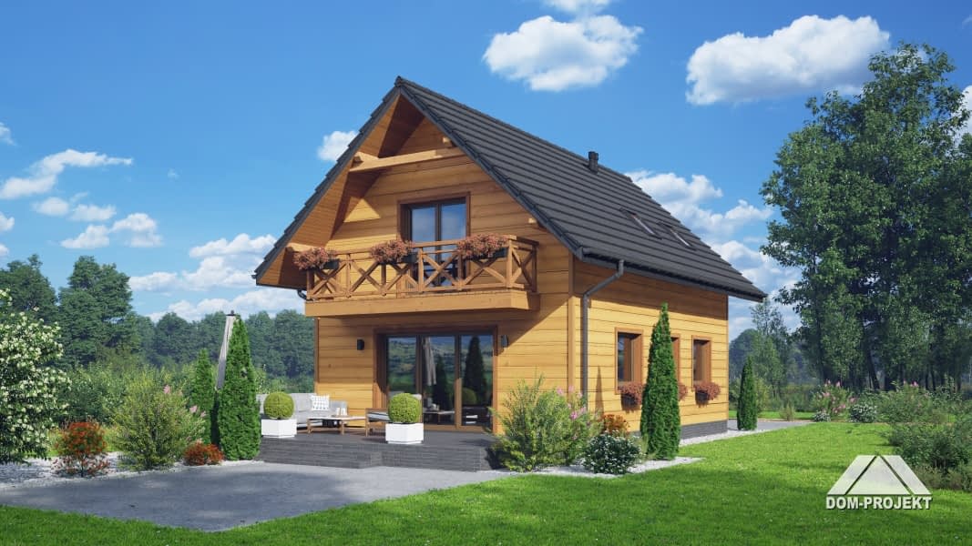 Dom w konstrukcji szkieletu drewnianego. Na parterze salon z aneksem kuchennym oraz wyjściem na taras. Komunikacja, wc, wiatrołap. Na poddaszu trzy pokoje, łazienka, komunikacja oraz balkon. Zwarta bryła budynku i dach dwuspadowy sprzyjają szybkiej i taniej budowie oraz niskim kosztom eksploatacji.Rzuty