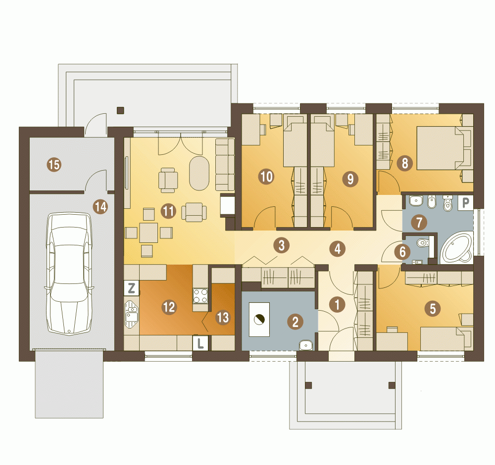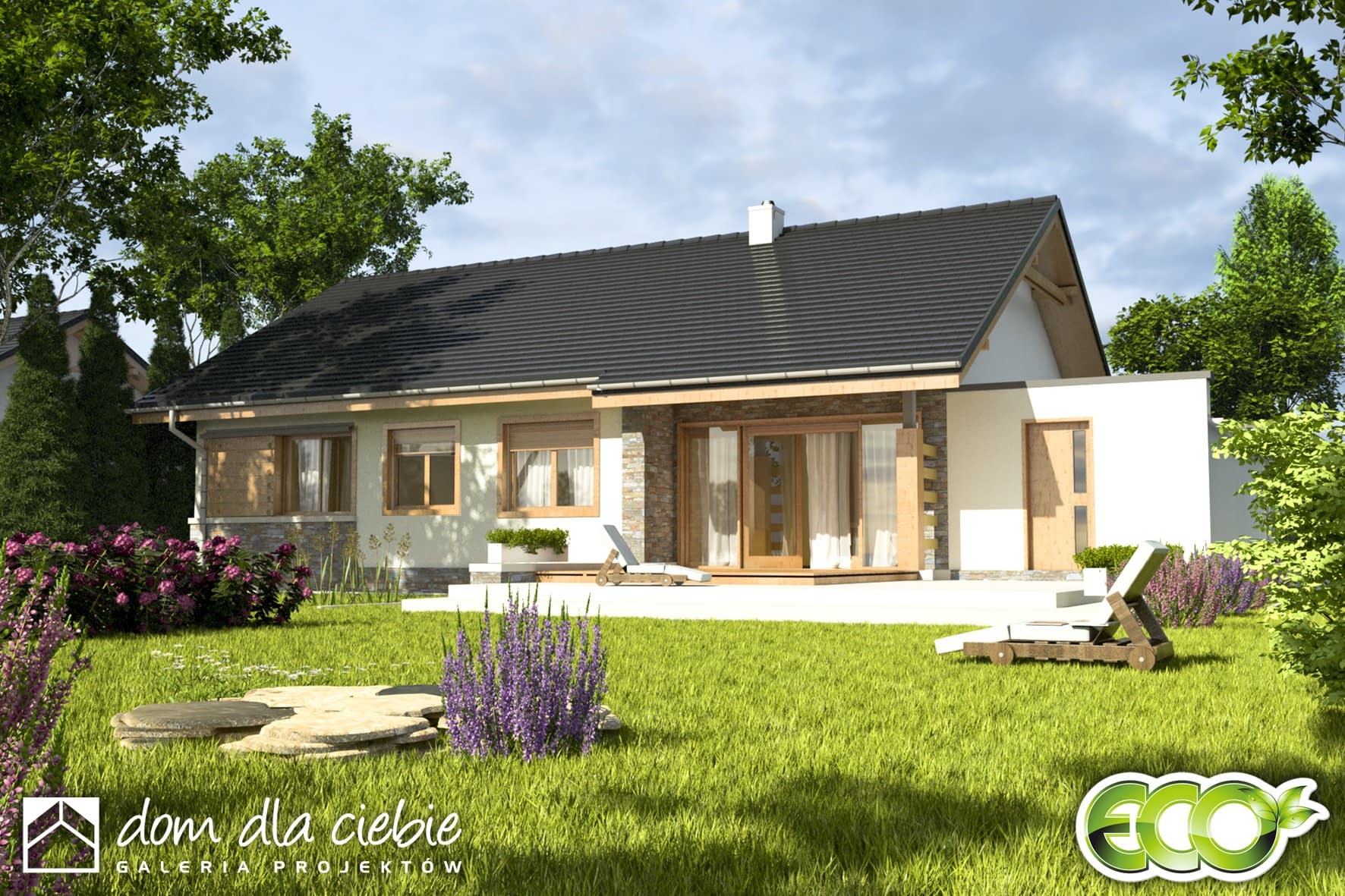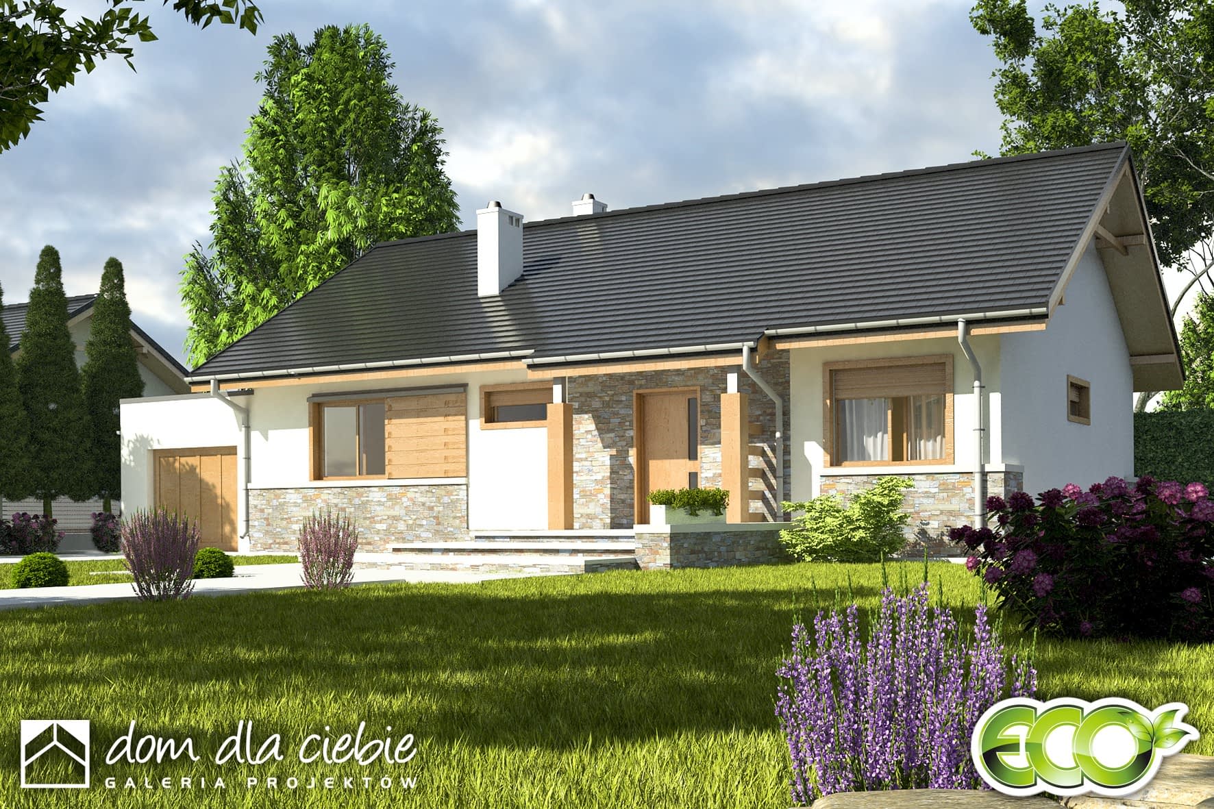 Projekt Gąska II to wygodny parterowy dom jednorodzinny dla 4-5-cio osobowej rodziny. Domek mieści w sobie cztery sypialnie i salon, łazienkę, WC rozplanowane wokół centralnego holu. Druga część holu została połączona z funkcją garderoby. Kuchnię zaprojektowano jako otwartą na salon, przy której mamy spiżarnię. Parametry kotłowni - dostępnej z wiatrołapu - pomieszczenia technicznego umożliwiają ogrzewanie dom gazem lub paliwem stałym (do wyboru). Do części mieszkalnej przylega duży garaż jednostanowiskowy z wejściem z zewnątrz. Na elewacji budynku zaproponowano materiał drewniany i kamienny.
