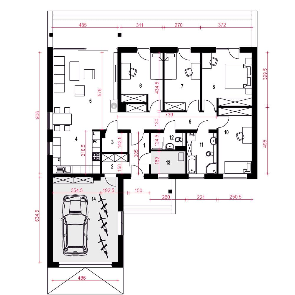 Projekt domu Gąska III z garażem to praktyczna i estetyczna propozycja dla 4–5-osobowej rodziny, która szuka wygodnego i ekonomicznego miejsca do życia. Budynek zaprojektowano z myślą o optymalnym wykorzystaniu przestrzeni przy jednoczesnym zachowaniu nowoczesnego wyglądu.W domu zaplanowano cztery sypialnie, które zapewniają prywatność wszystkim domownikom, a przestronny salon z dużymi oknami łączy się z kuchnią i jadalnią, tworząc otwartą i funkcjonalną strefę dzienną. Obok kuchni znajduje się spiżarnia, a w części wejściowej – wiatrołap z garderobą. Dwie łazienki zwiększają wygodę codziennego użytkowania, a kotłownia dostępna z wiatrołapu została oddzielona od części mieszkalnej.Pomieszczenia rozplanowano wzdłuż praktycznego korytarza, co ułatwia komunikację. Garaż od frontu oraz zadaszenia z przodu i od strony ogrodu dodają funkcjonalności. Elewacja z drewna i kamienia nadaje domowi nowoczesny, a zarazem ciepły wygląd.Gąska III to projekt, który łączy komfort, funkcjonalność i estetykę z rozsądnymi kosztami budowy i użytkowania – idealny do miasta i na przedmieścia.