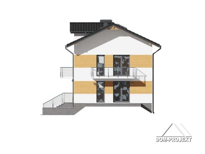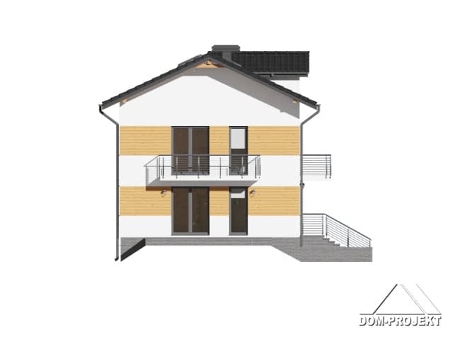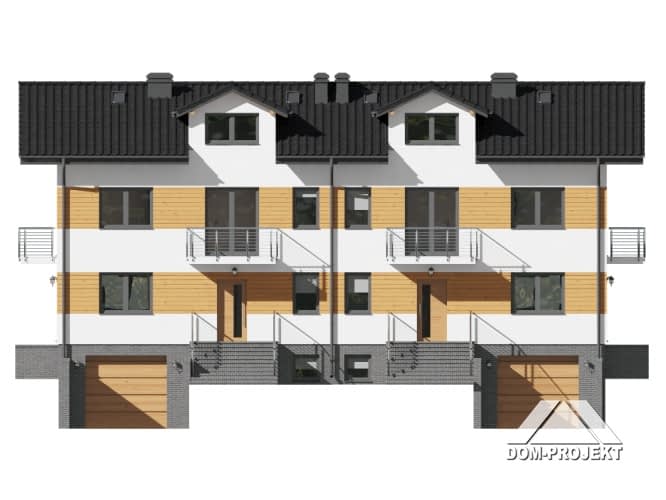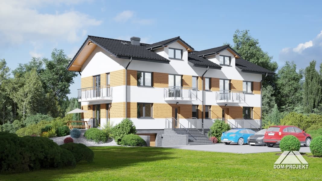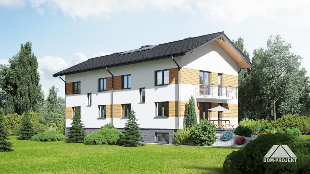 Dom jednorodzinny z dwoma lokalami. Każdy lokal składa się z: dużego salonu z aneksem kuchennym, kominkiem, wyjściem na taras i schodami na poddasze. Pokój, łazienka, wiatrołap. Na piętrze trzy pokoje, łazienka, komunikacja i dwa balkony. W piwnicy garaż, kotłownia gazowa, kotłownia na paliwa stałe i schody na parter.Rzuty