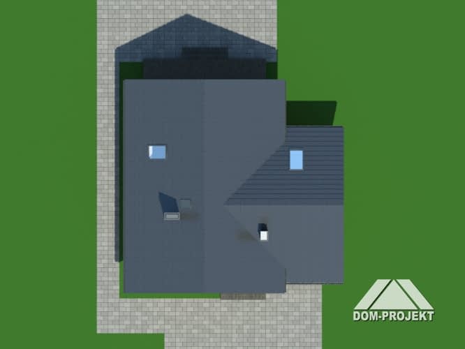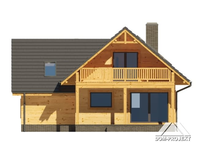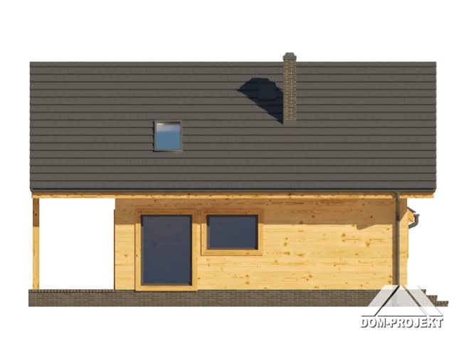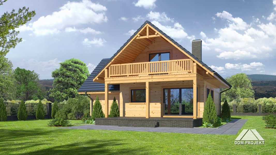 Nieduży dom z poddaszem mieszkalnym. Na parterze salon z kominkiem, kuchnia, łazienka i dobudowany jednostanowiskowy garaż. Z salonu wyjście na częściowo zadaszony taras. Usytuowane w narożu salonu schody prowadzą na poddasze, gdzie mieszczą się trzy sypialnie, garderoba i łazienka.Rzuty