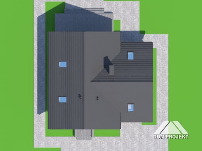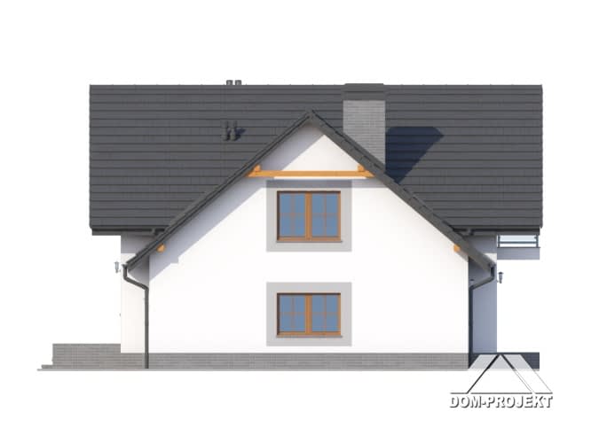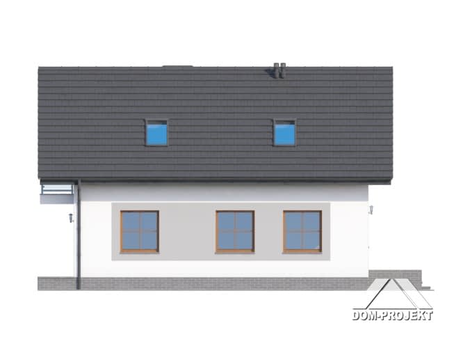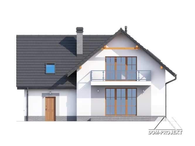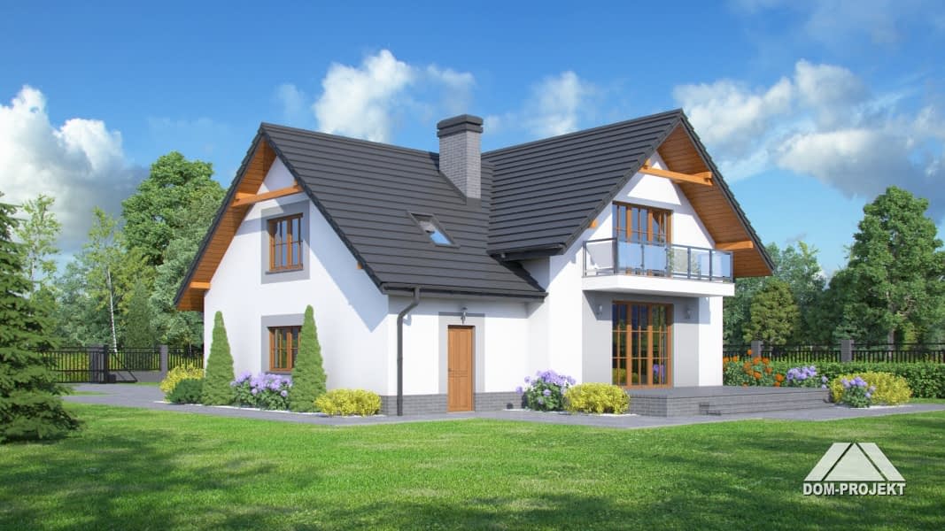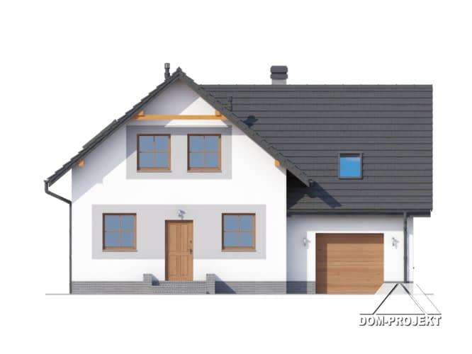 Dom z poddaszem użytkowym. Duży salon z aneksem kuchennym, kominkiem, schodami na poddasze i wyjściem na taras. Łazienka, wiatrołap, komunikacja, garaż i kotłownia. Na poddaszu trzy pokoje, łazienka, komunikacja i balkon. Zwarta bryła budynku sprzyjaj szybkiej i taniej budowie i niskim kosztom eksploatacji.Rzuty