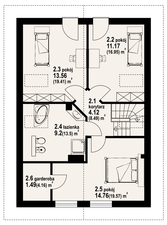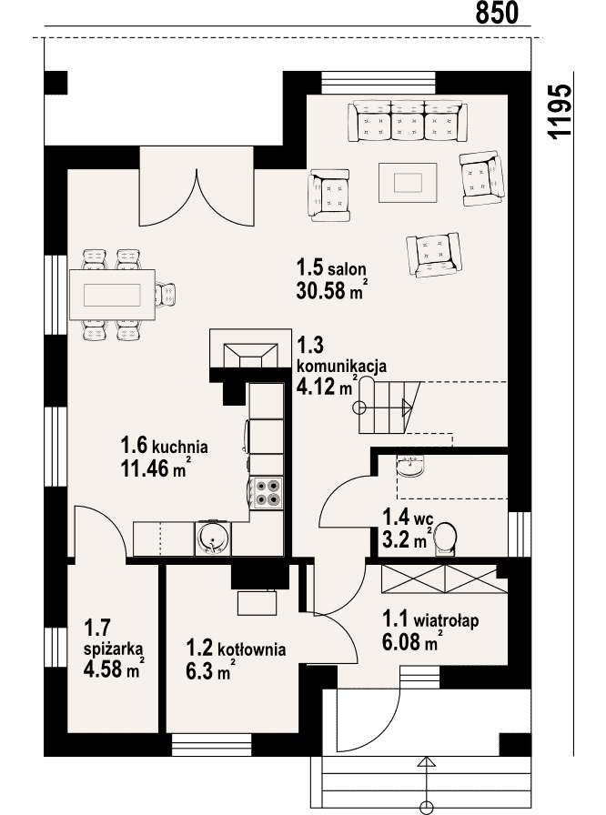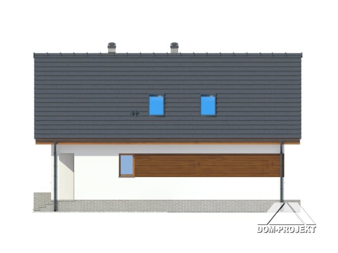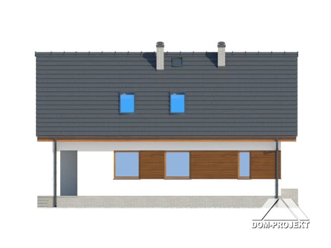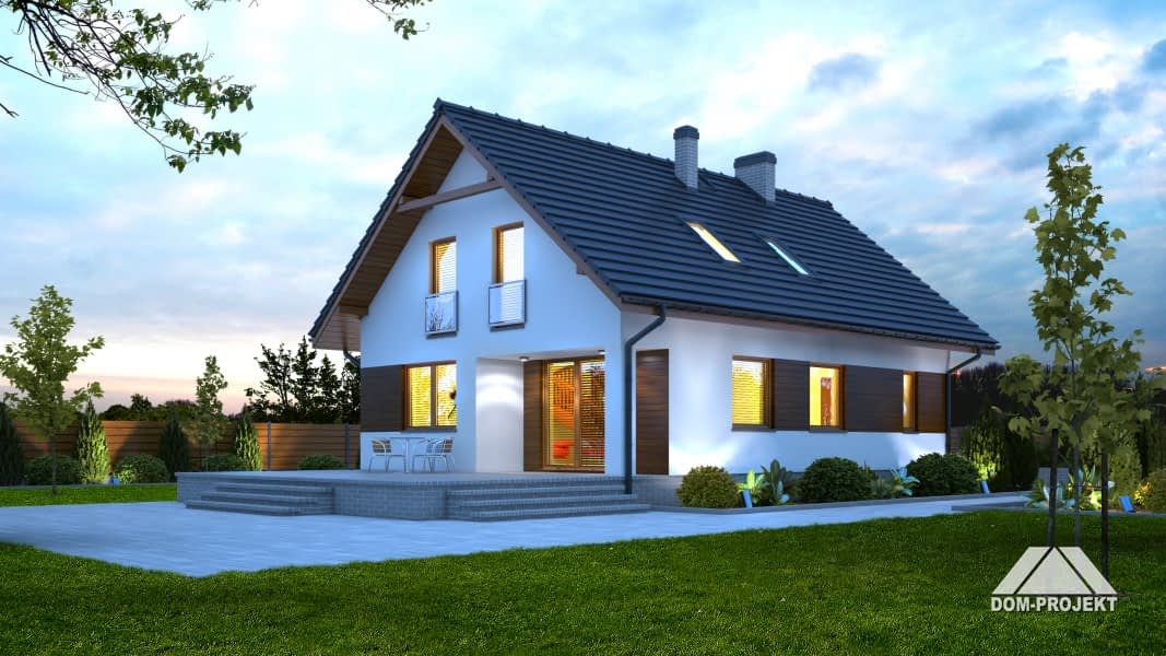 Dom z poddaszem użytkowym o stosunkowo niedużej powierzchni, co czyni go ekonomicznym w budowie i późniejszym użytkowaniu. Parter to strefa dzienna, a w niej przestronny salon z kominkiem i częściowo zamknięta kuchnia ze spiżarką. Na parterze znajduje się również spora kotłownia. Poddasze to strefa nocna z trzema wygodnymi sypialniami i dużą łazienką.Rzuty