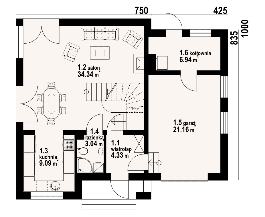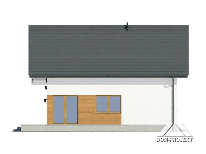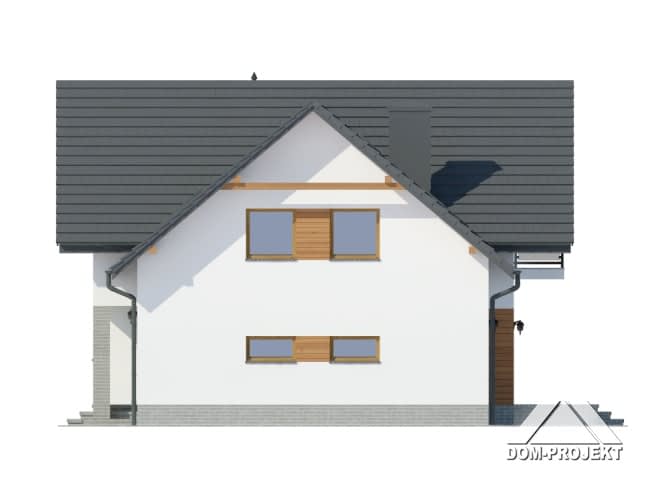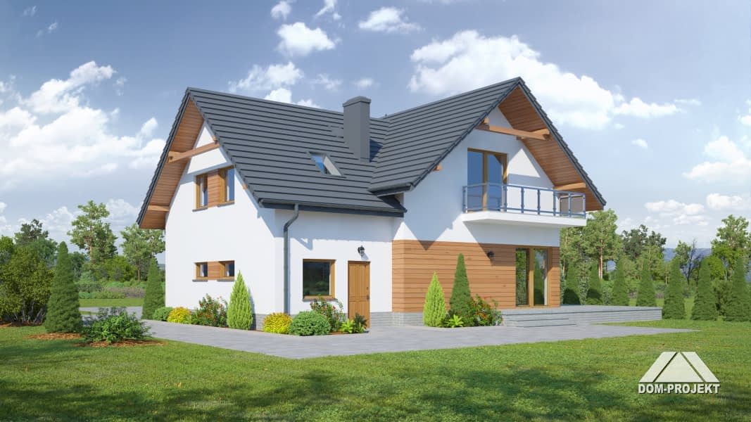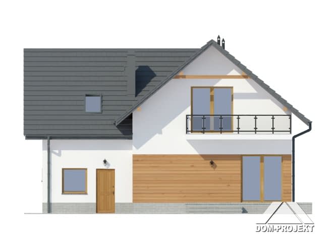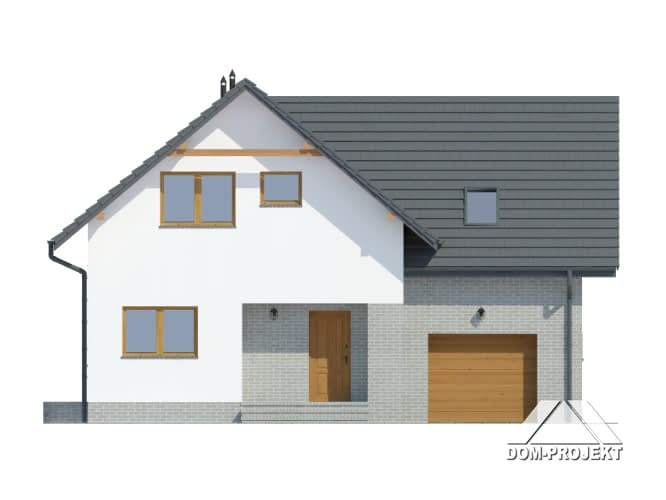 Dom z garażem i poddaszem użytkowym. Duży salon z aneksem kuchennym, kominkiem, wyjściem na taras i schodami na poddasze. Łazienka, wiatrołap, garaż i kotłownia. Na poddaszu dwa pokoje, łazienka, balkon, komunikacja i dwa strychy, które niewielkim kosztem mogą być wykorzystane jako pokoje. Zwarta bryła budynku sprzyja szybkiej budowie i niskim kosztom eksploatacji.Rzuty