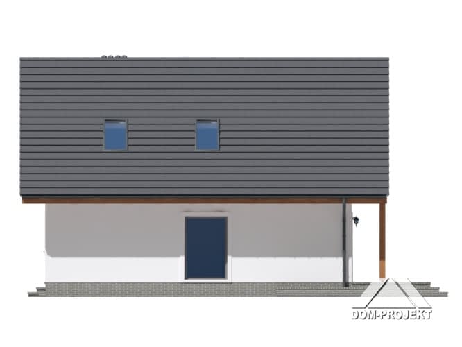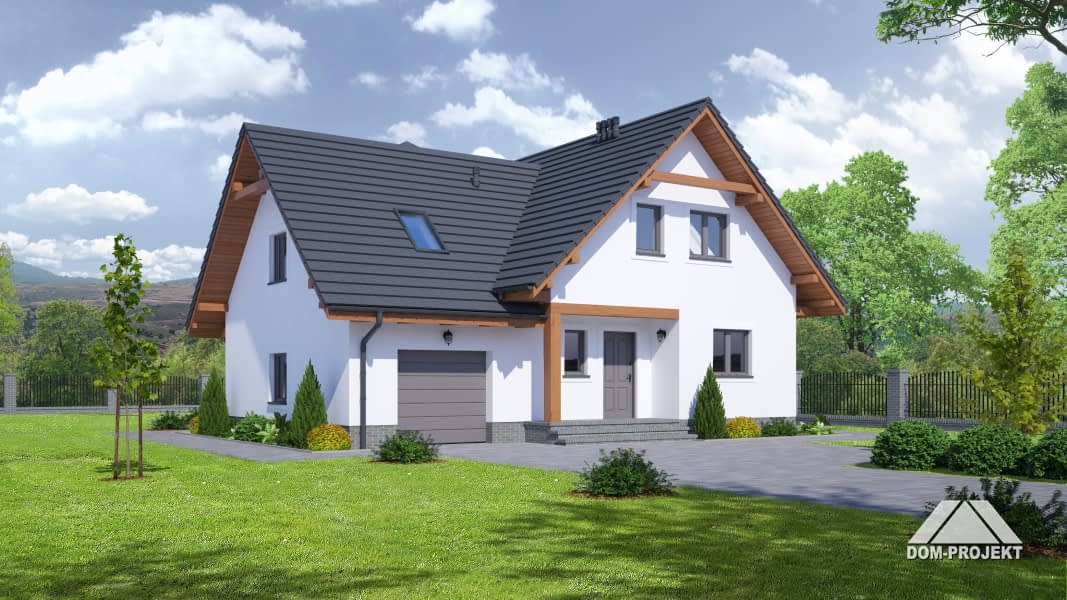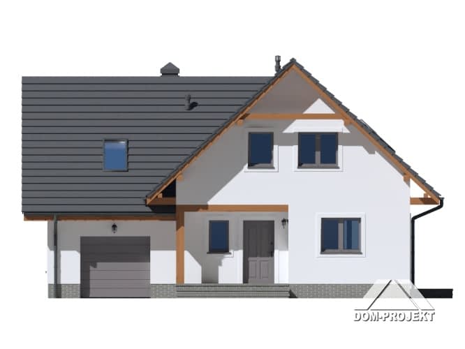Dom w technologi szkieletowej z tynkiem na zewnątrz. Na parterze duży salon, kuchnia z wydzieloną spiżarką, pokój, schody na poddasze i łazienka. Garaż wraz z kotłownią w bocznej części. Na poddaszu 3 pokoje, łazienka, garderoba. Nad garażem pomieszczenie gospodarcze oraz pralnia.Rzuty