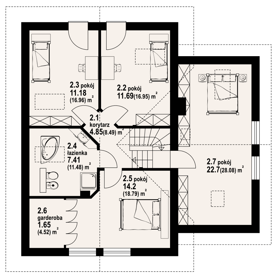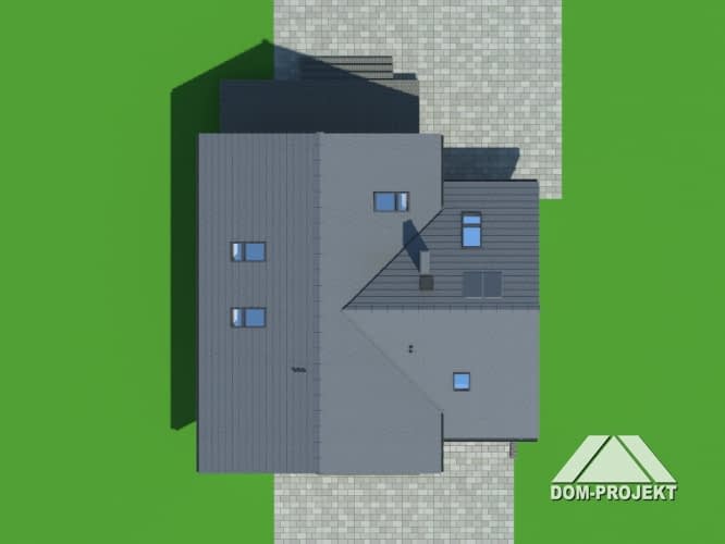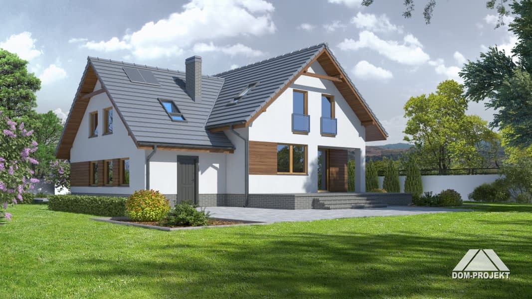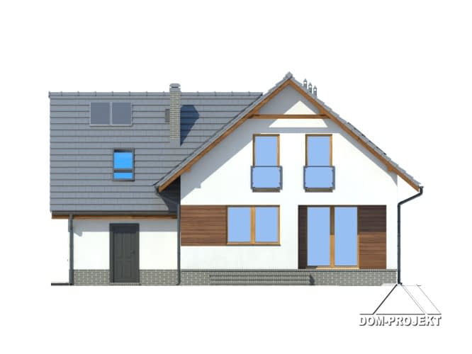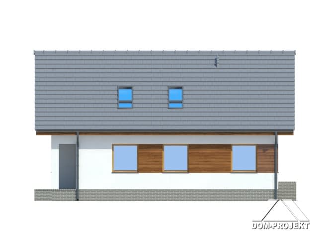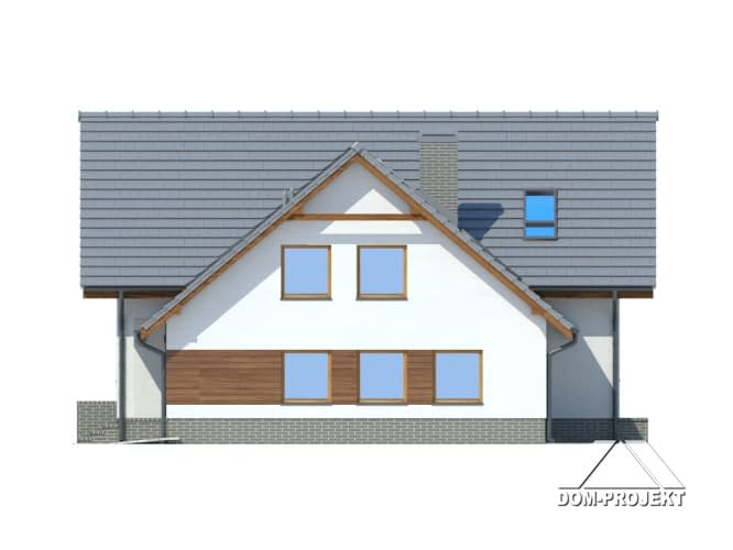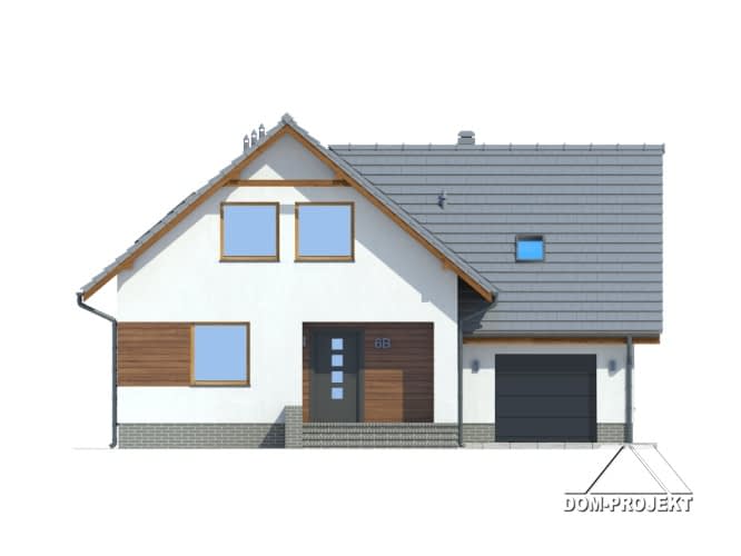 Atrakcyjny dom o funkcjonalnie zaprojektowanym układzie pomieszczeń idealny dla dla cztero-, pięcioosobowej rodziny. Głównym pomieszczeniem parteru jest salon z kominkiem i aneksem kuchennym. Ponadto na parterze pokój przy wejściu, który może pełnić funkcję gabinetu, biura w domu bądź sypialni. Na poddaszu mieszczą się cztery duże sypialnie i łazienka. Jedna z sypialni posiada garderobę. Program domu uzupełnia garaż z kotłownią.Rzuty