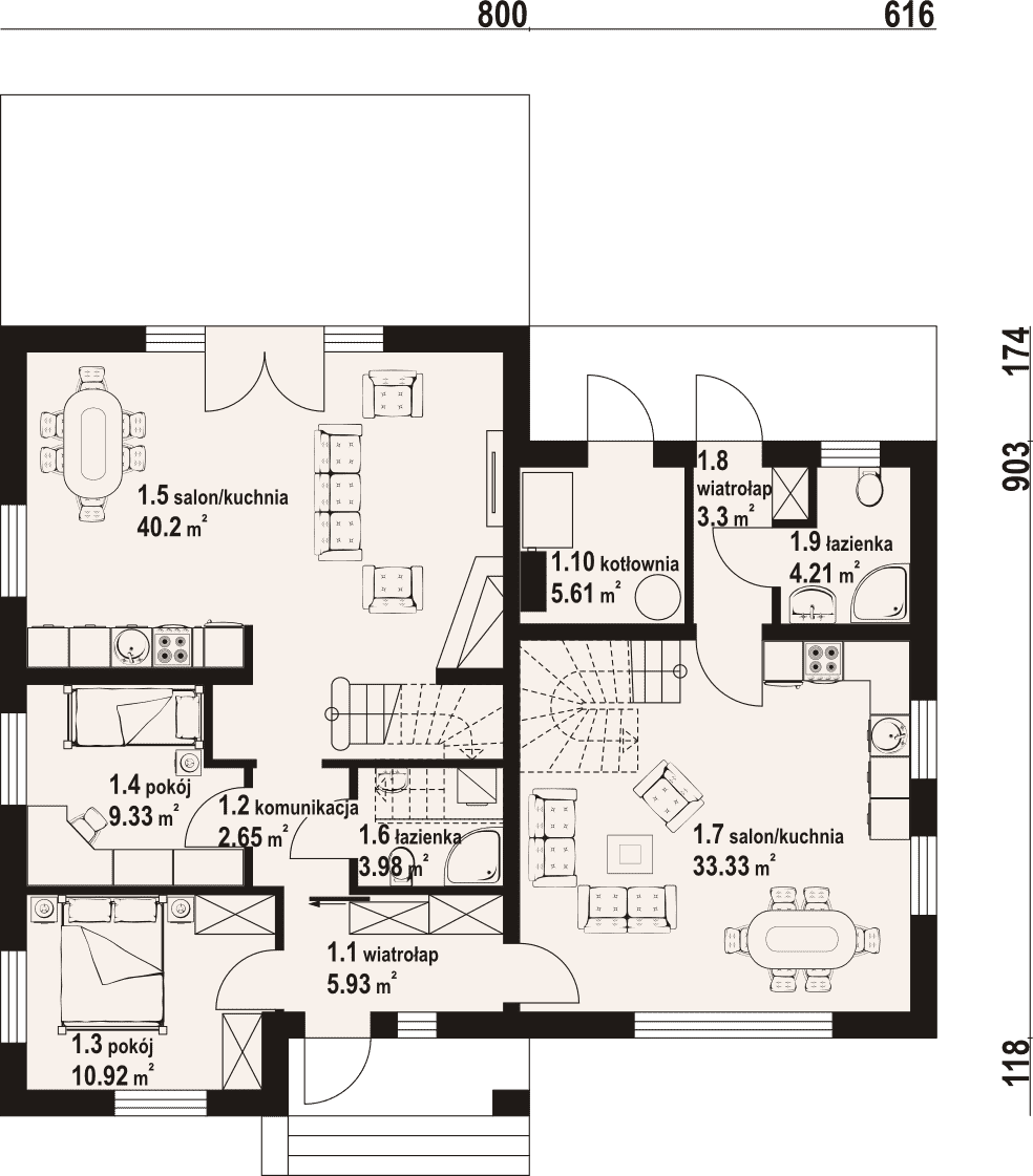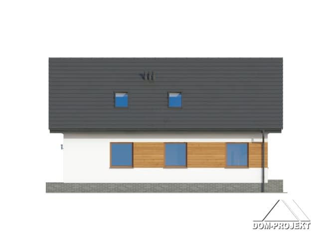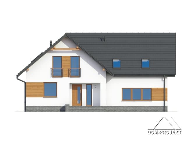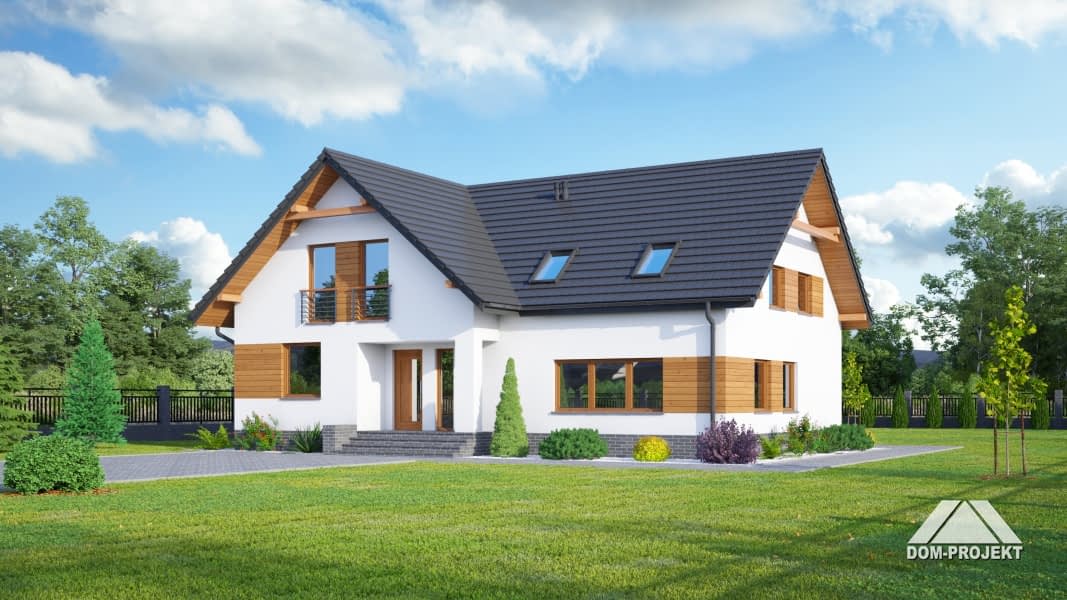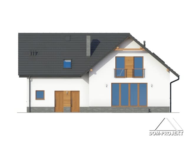 Dom jednorodzinny dwulokalowy. Duży salon z aneksem kuchennym, kominkiem, wyjściem na taras i schodami na poddasze. Dwa pokoje, łazienka, wiatrołap. Na poddaszu trzy pokoje, łazienka i garderoba. W drugim lokalu Salon z aneksem kuchennym i schodami na poddasze. Łazienka, wiatrołap i kotłownia. Na poddaszu dwa pokoje, łazienka i komunikacja.Rzuty