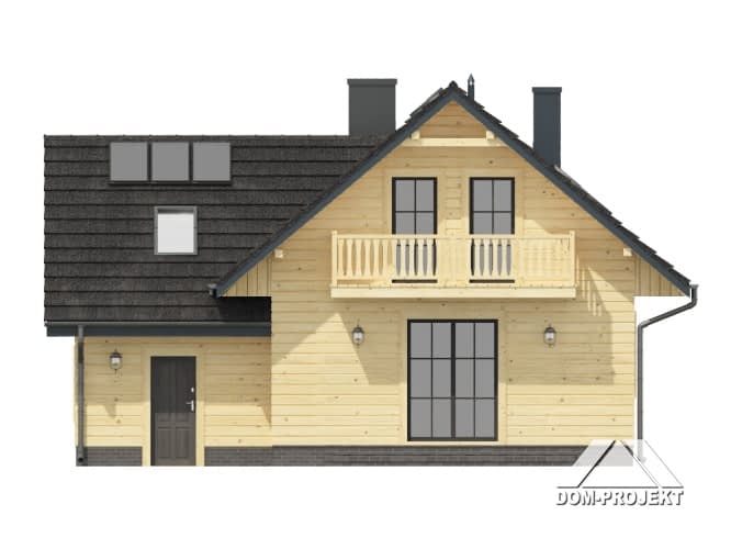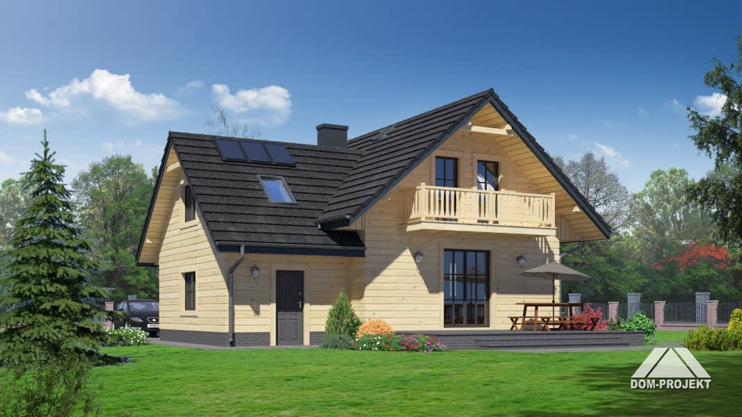 Mały dom z poddaszem mieszkalnym i dobudowanym garażem. Na parterze salon z kominkiem, kuchnia i wydzielona kotłownia. Schody z salonu prowadzą na poddasze, na którym zaprojektowano cztery pokoje i łazienkę. Dwa pokoje posiadają wyjście na balkon. Niski koszt realizacji i użytkowania.Rzuty