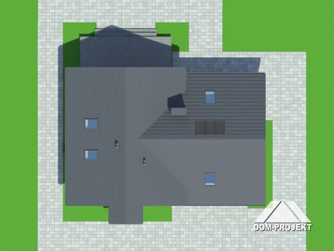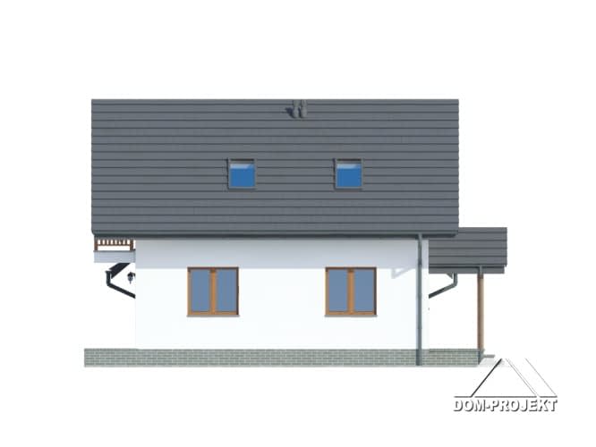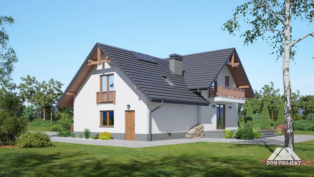 Dom jednorodzinny z garażem na dwa samochody. Nad garażem strych, który łatwo można przeznaczyć na pomieszczenia mieszkalne. Salon z aneksem kuchennym, wyjściem na taras i schodami na poddasze. Łazienka , wiatrołap, garaż na dwa samochody, kotłownia na gaz. Na poddaszu trzy pokoje, łazienka, komunikacja, strych. Dwa pokoje mają balkon.Rzuty