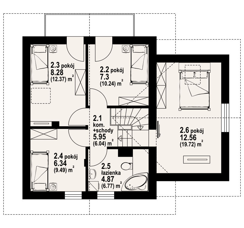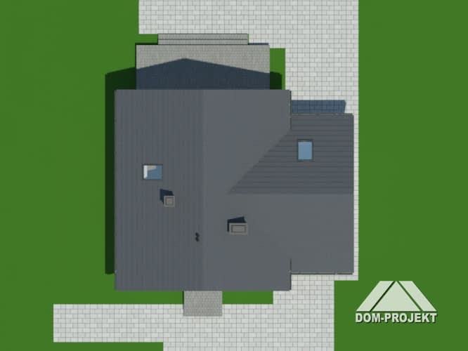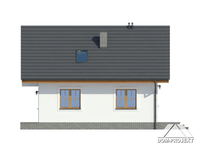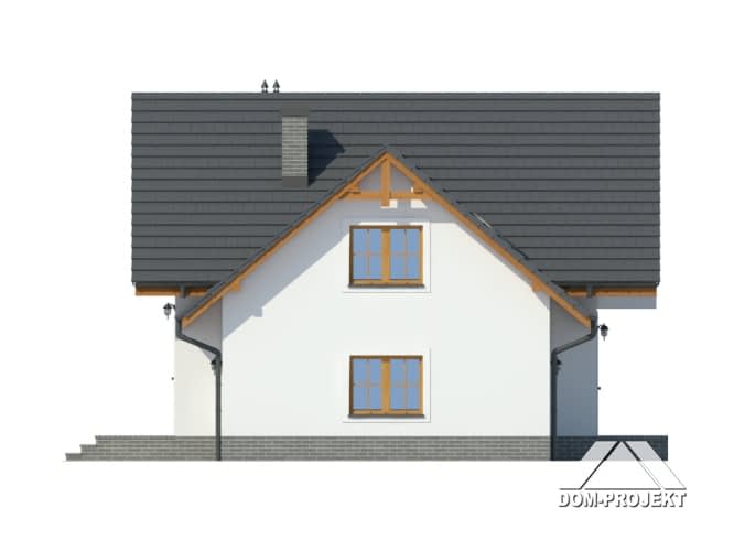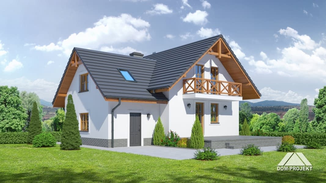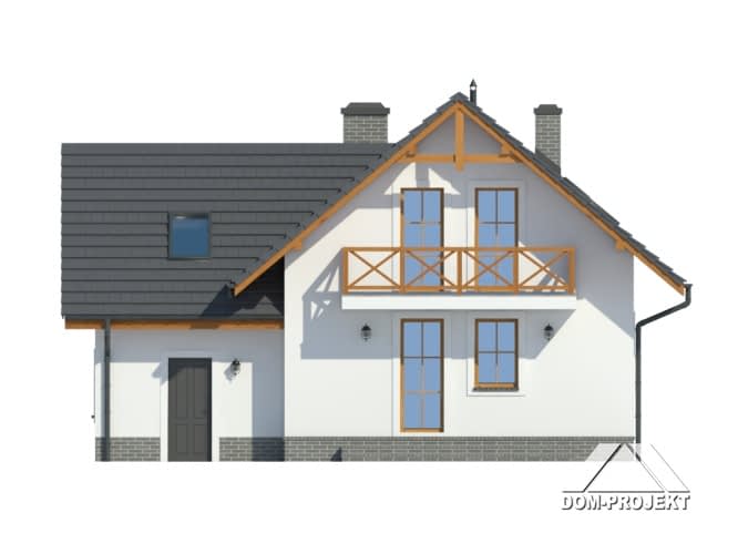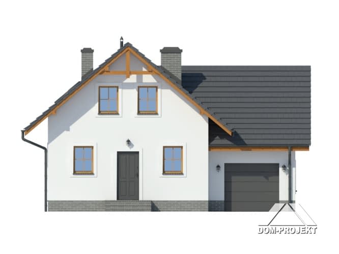 Dom z poddaszem użytkowym. Duży salon z kominkiem, wyjściem na taras, schodami na poddasze i przejściem do kuchni. Wiatrołap, wc, garaż. Na poddaszu cztery pokoje, łazienka i komunikacja. Dwa pokoje mają dostęp do balkonu. Zwarta bryła budynku i dach dwuspadowy sprzyjają szybkiej budowie i niskim kosztom eksploatacji.Rzuty