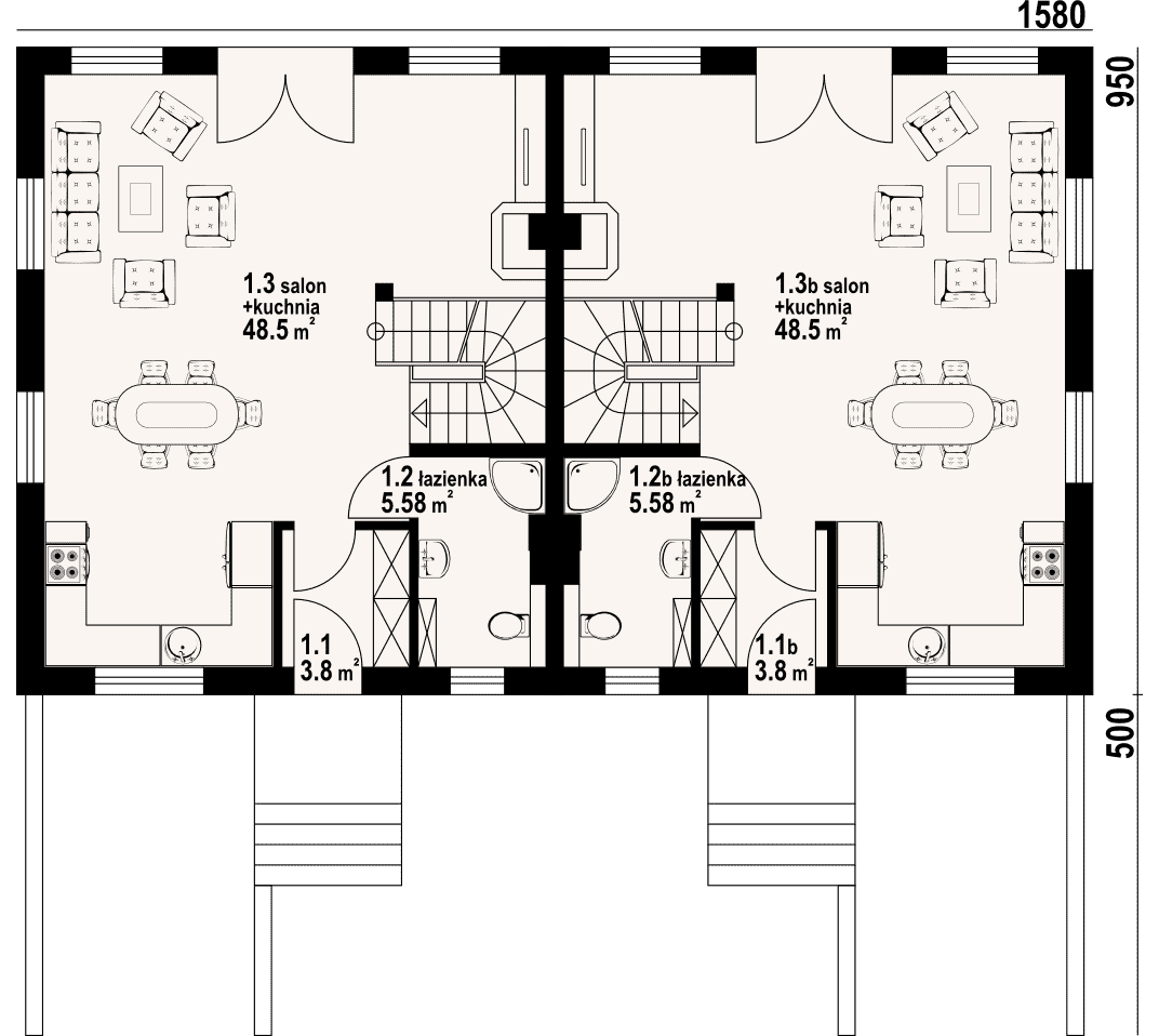 Dom jednorodzinny z dwoma mieszkaniami. Mieszkania są identyczne (lustrzane odbicie). Każde z nich składa się z: dużego salonu z aneksem kuchennym, kominkiem i schodami na poddasze. Łazienka, wiatrołap. Na poddaszu trzy wygodne pokoje, duża łazienka, komunikacja i dwa balkony. W piwnicach garaż, kotłownia i pralnia. Zwarta bryła budynku.Rzuty