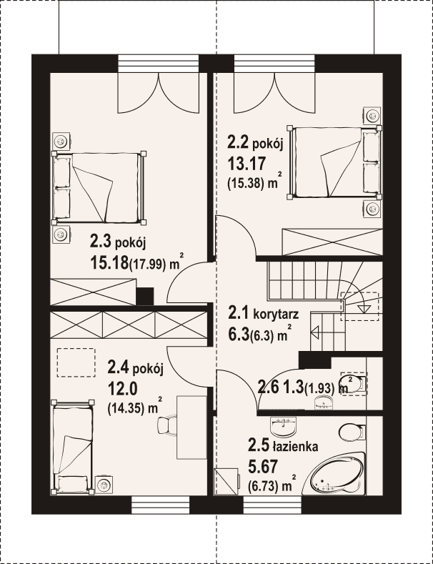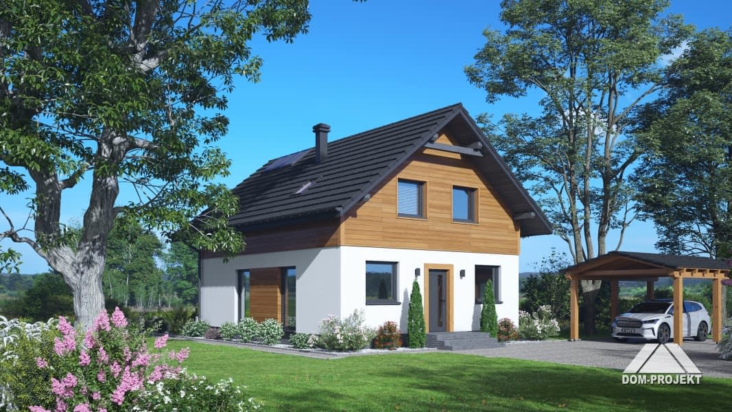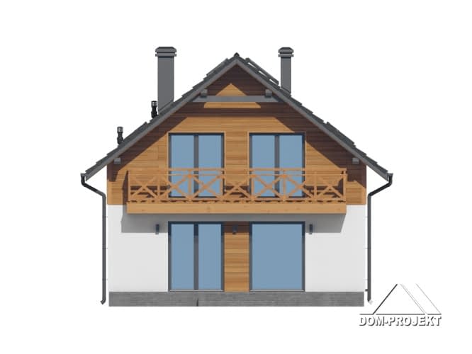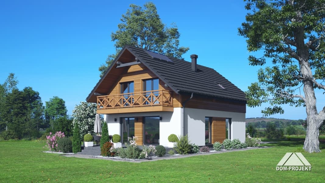 Dom z poddaszem użytkowym. Na parterze salon z aneksem kuchennym, kominkiem oraz wyjściem na taras. Komunikacja, pokój do pracy, wc, wiatrołap, kotłownia. Na poddaszu trzy pokoje, wc, łazienka, korytarz. Balkon dostępny z dwóch pokoi. Zwarta bryła budynku oraz dach dwuspadowy sprzyjają szybkiej i taniej budowie oraz niskim kosztom eksploatacji.Rzuty