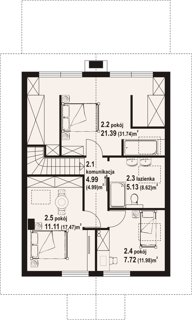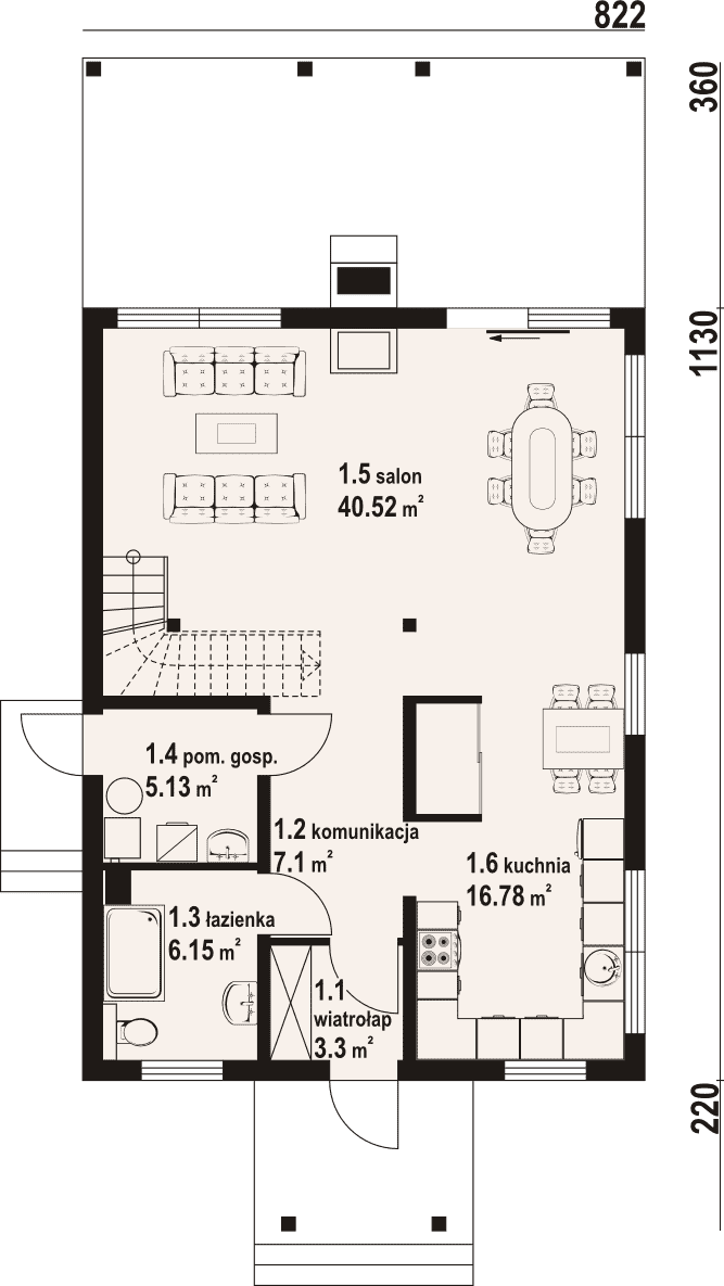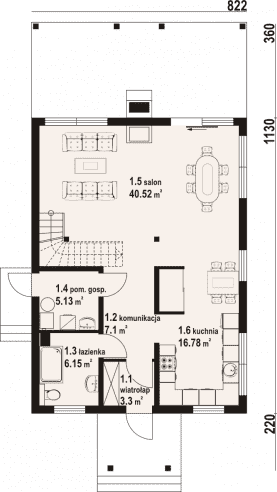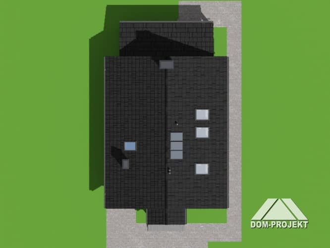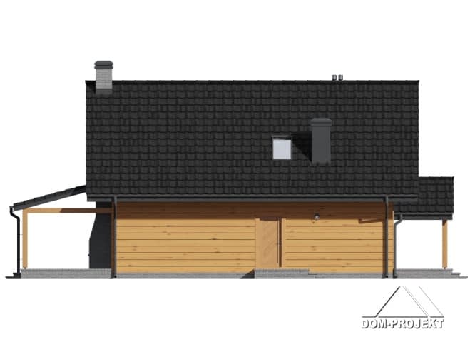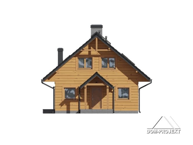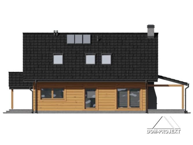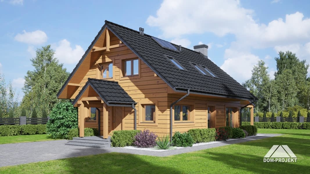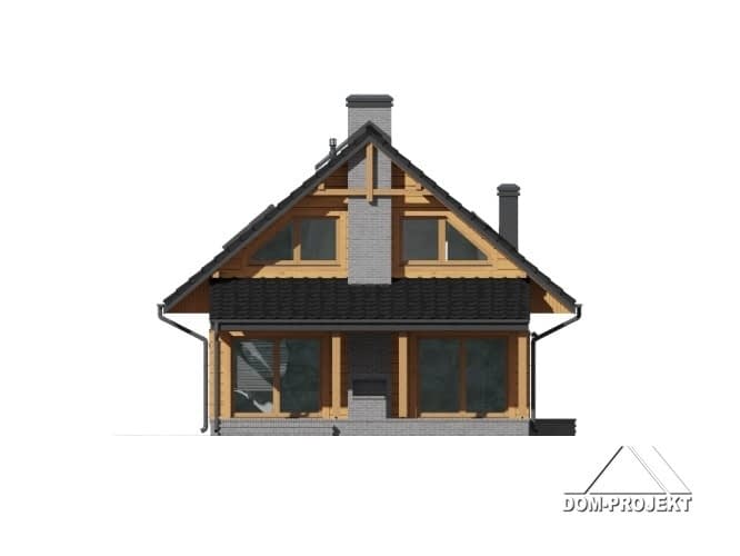 Dom w konstrukcji szkieletu drewnianego. Duży salon z aneksem kuchennym, kominkiem, schodami na poddasze i wyjściem na zadaszony taras. Na tarasie kominek. Łazienka, komunikacja, wiatrołap i pomieszczenie gospodarcze. Na poddaszu trzy pokoje, łazienka i komunikacja. Zwarta bryła budynku i dach dwuspadowy sprzyjają szybkiej i taniej budowie i niskim kosztom eksploatacji.Rzuty