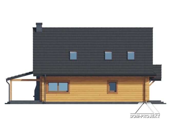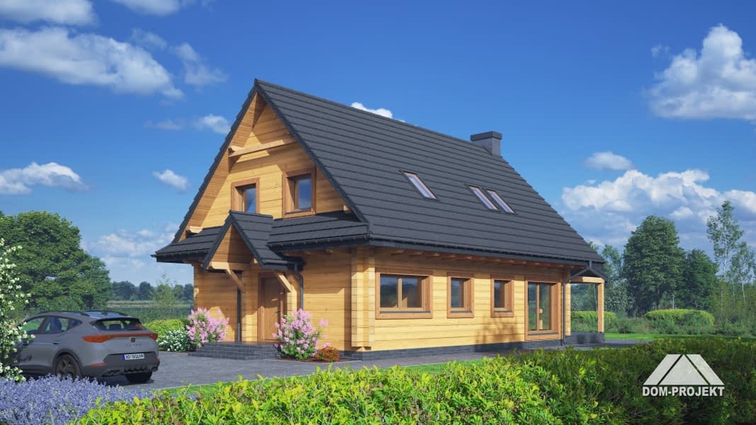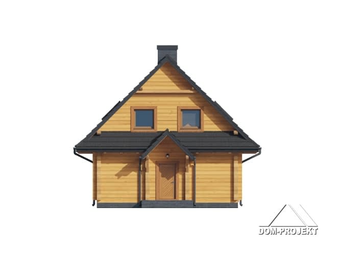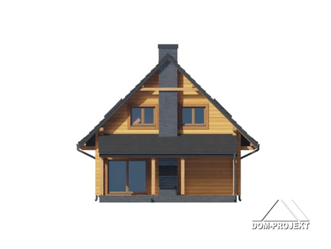 Dom z bali. Na parterze salon z kominkiem, wyjściem na duży, zadaszony taras i schodami na poddasze. Kuchnia, pokój, wiatrołap, pomieszczenie gospodarcze, łazienka, komunikacja. Na poddaszu cztery pokoje, łazienka, komunikacja. Zwarta bryła budynku oraz dach dwuspadowy sprzyjają szybkiej i taniej budowie oraz niskim kosztom eksploatacji.Rzuty