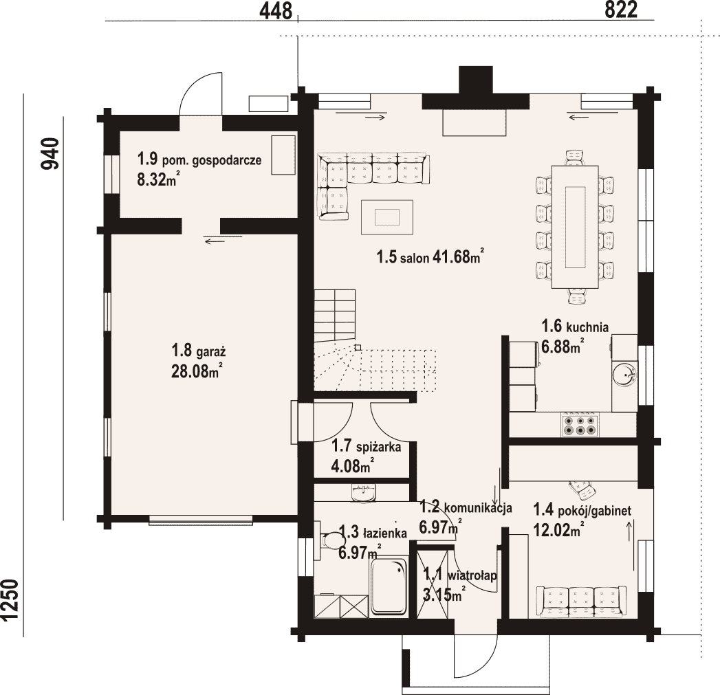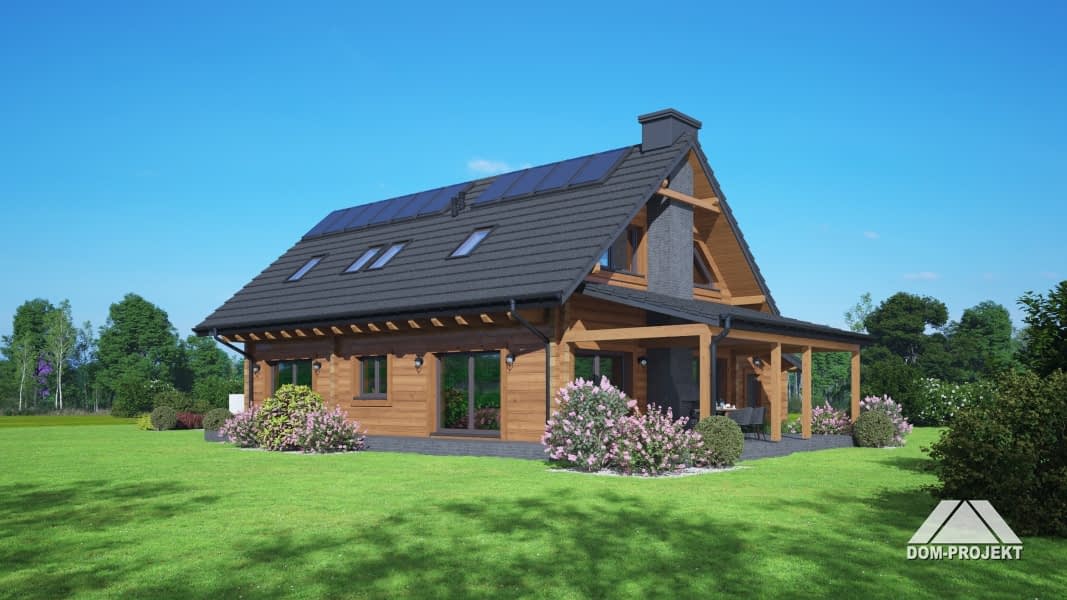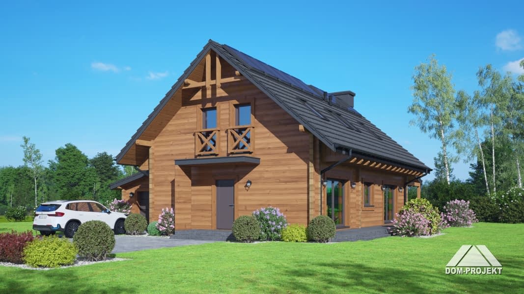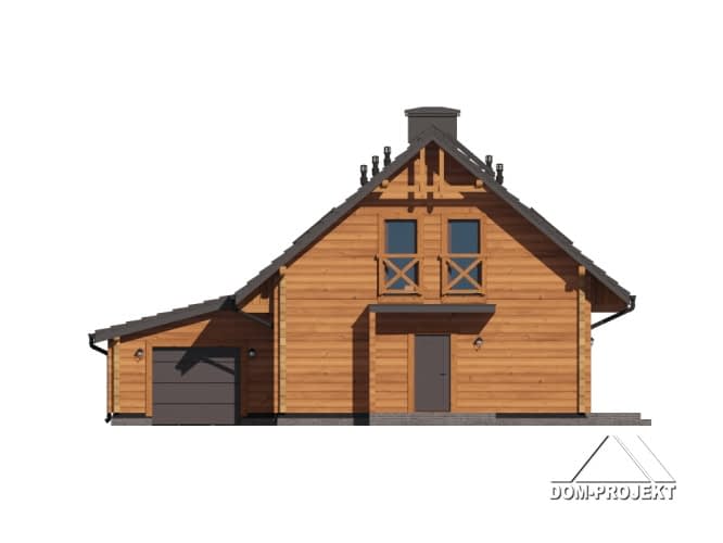 Nowoczesny, prosty, funkcjonalny dom z bali, z poddaszem użytkowym. Na parterze duży salon, otwarta kuchnia, wygodna łazienka i gabinet. Spiżarka z dostępem z części mieszkalnej oraz z garażu. Przy garażu pomieszczenie gospodarcze. Na poddaszu trzy wygodne pokoje oraz łazienka. Grupę projektów Głogoczów wyróżnia przede wszystkim nowoczesna, prosta forma oraz podwójny kominek - w salonie i na zadaszonym tarasie.Rzuty
