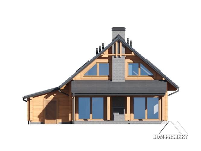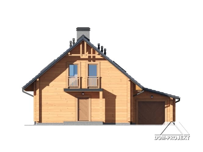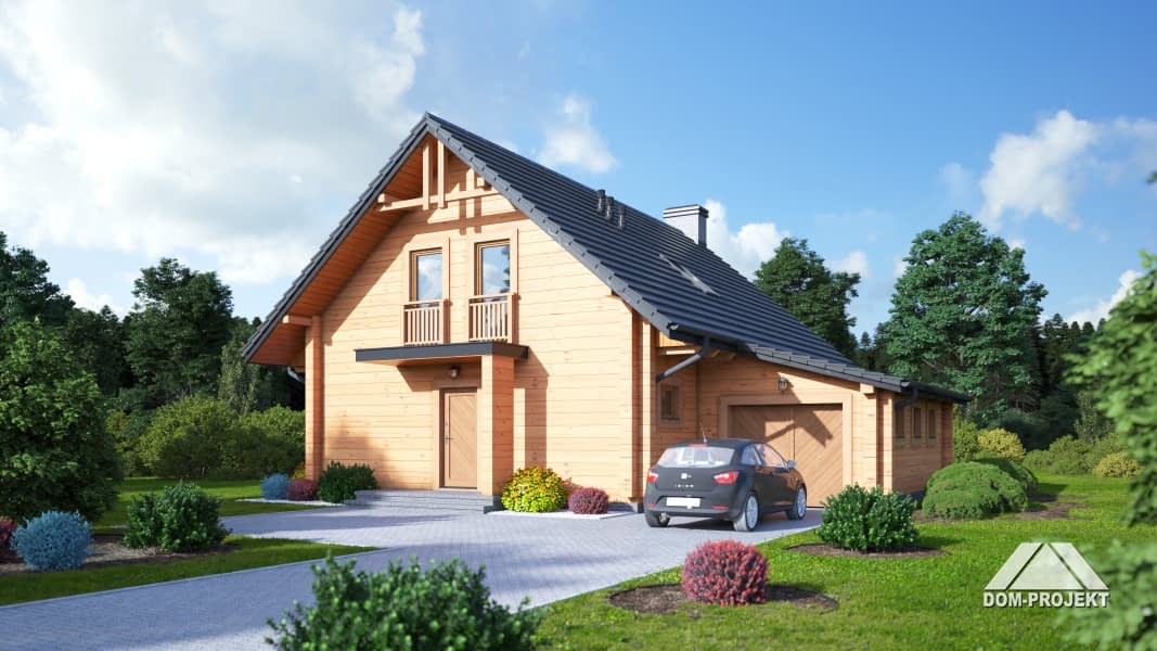 Dom z bali. Duży salon z aneksem kuchennym, kominkiem, schodami na poddasze i wyjściem na zadaszony taras. Na tarasie kominek. Pokój, łazienka, pralnia, wiatrołap i garaż. Na poddaszu dwa pokoje, łazienka, komunikacja i balkon.Rzuty