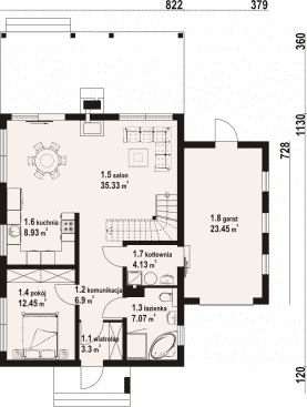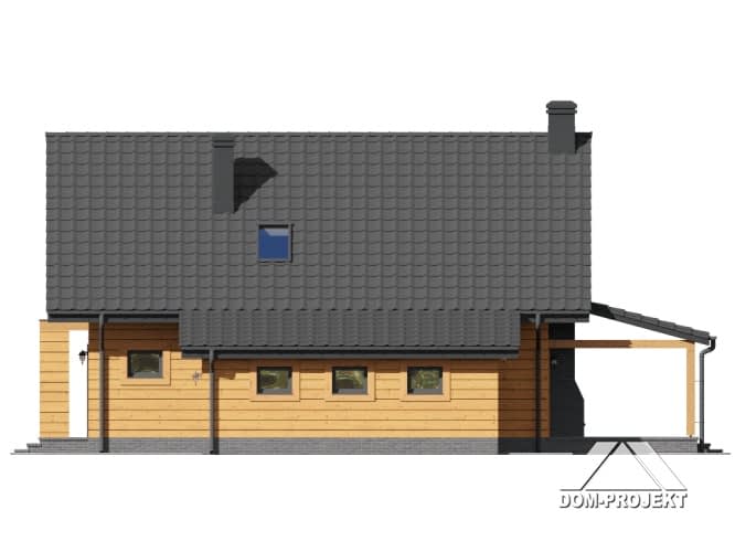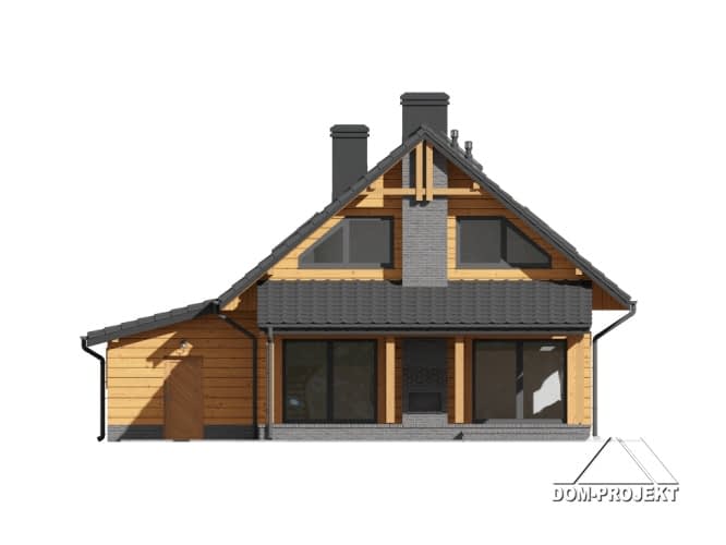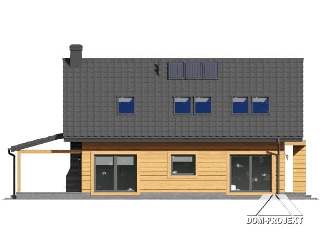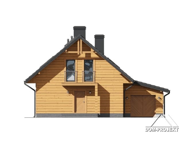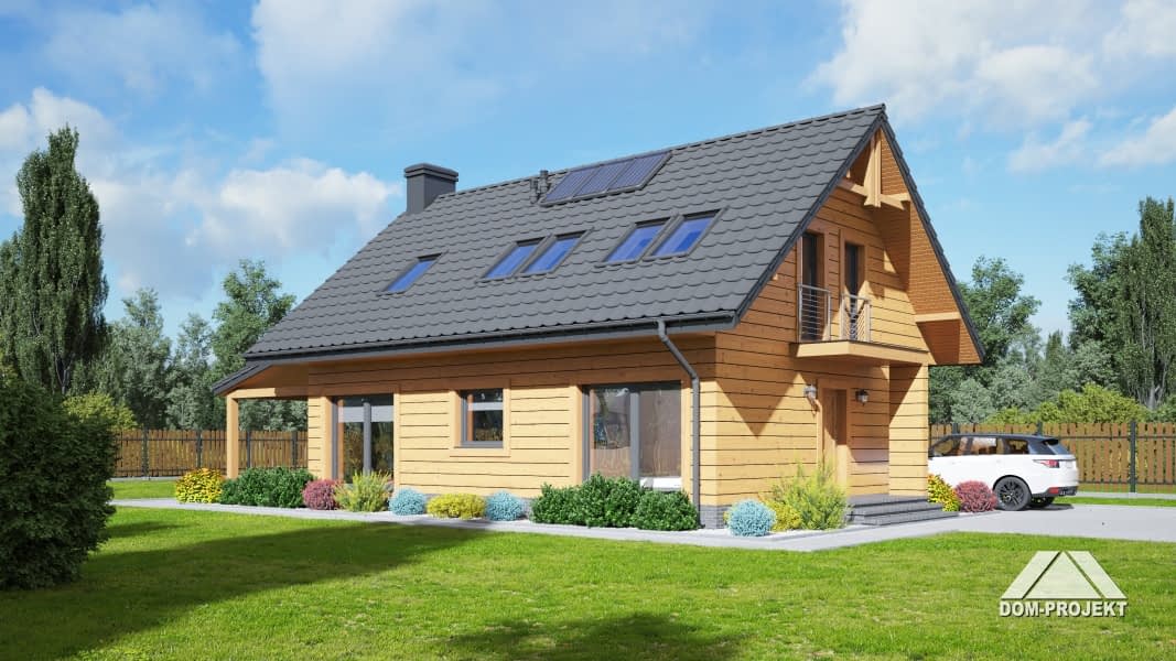 Dom w konstrukcji szkieletu drewnianego. Duży salon z aneksem kuchennym, kominkiem, schodami na poddasze i wyjściem na zadaszony taras. Na tarasie kominek. Pokój, łazienka, pralnia, wiatrołap i garaż. Na poddaszu dwa pokoje, łazienka, komunikacja i balkon. Zwarta bryła budynku i dach dwuspadowy sprzyjają szybkiej i taniej budowie i niskim kosztom eksploatacji.Rzuty