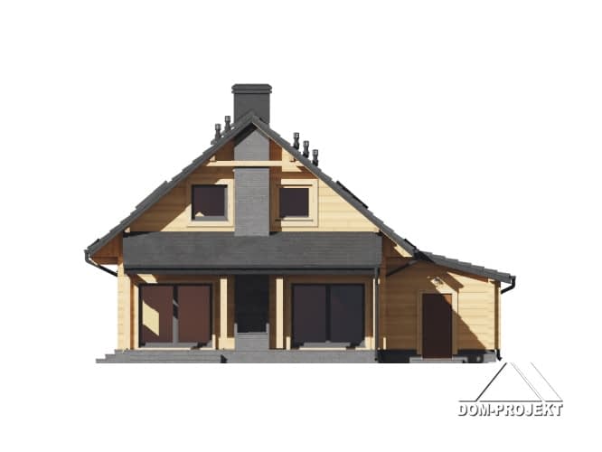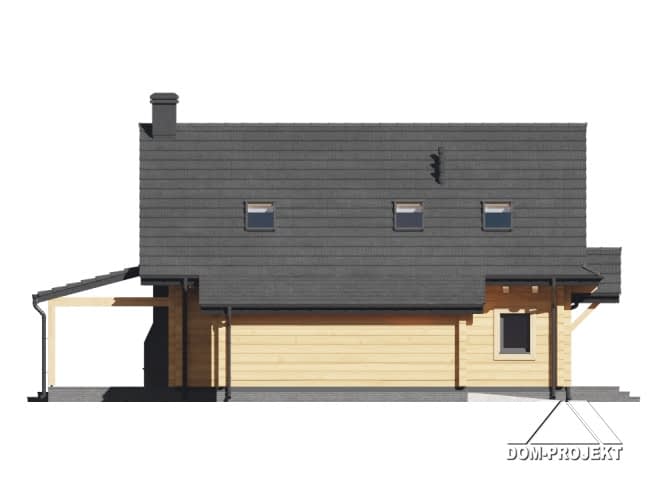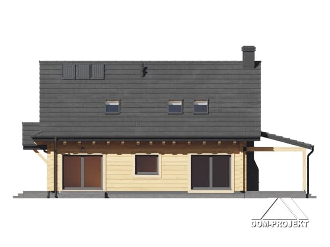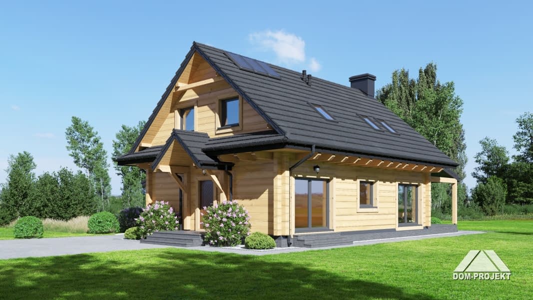 Dom z bali drewnianych. Na parterze duży salon z aneksem kuchennym, kominkiem oraz wyjściem na zadaszony taras. Pokój, łazienka, pralnia, wiatrołap, komunikacja oraz garaż. Na poddaszu cztery wygodne pokoje, łazienka, komunikacja. Zwarta bryła budynku i dach dwuspadowy sprzyjają szybkiej i taniej budowie oraz niskim kosztom eksploatacji.Rzuty