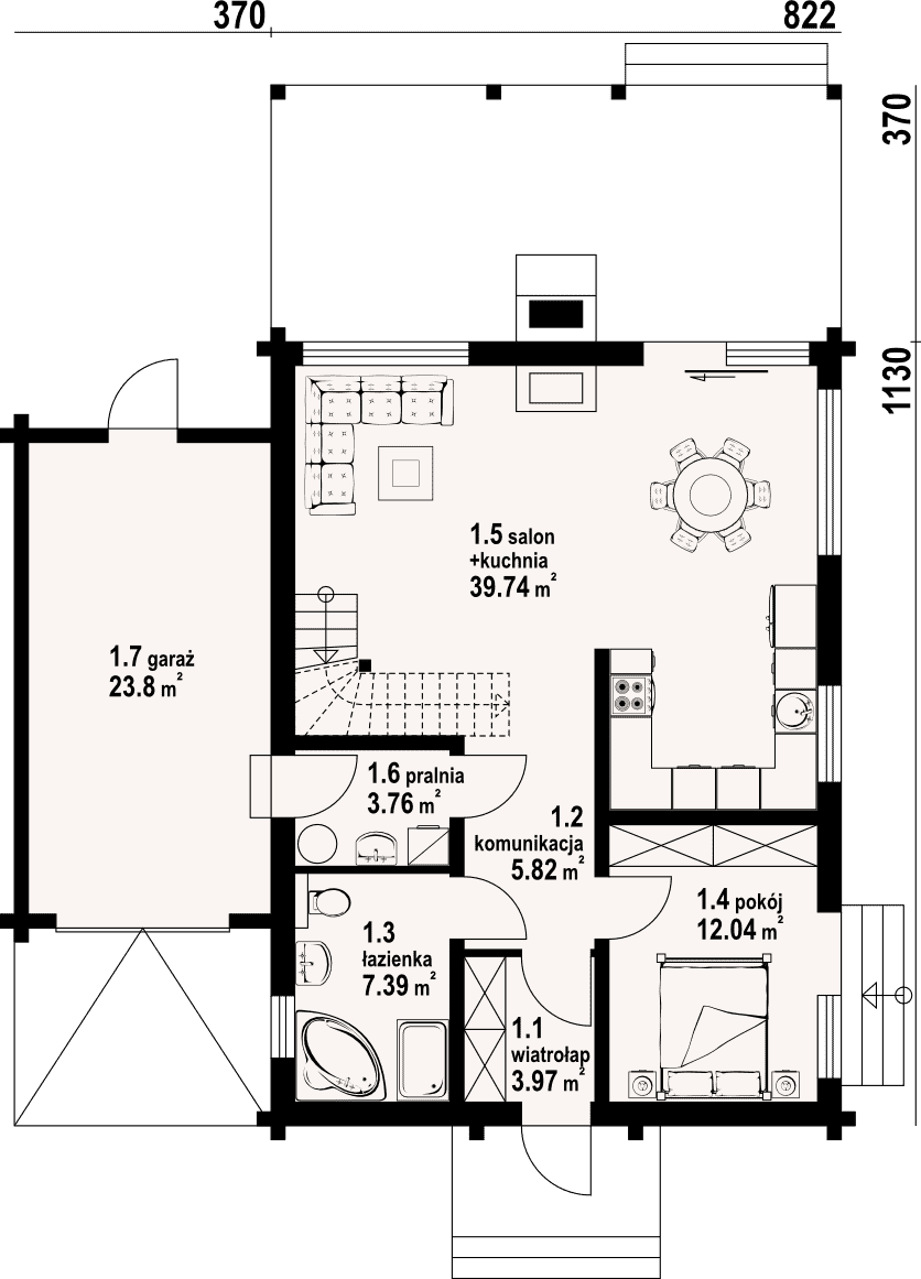 - 1.5 - kuchnia, salon39.74 m²