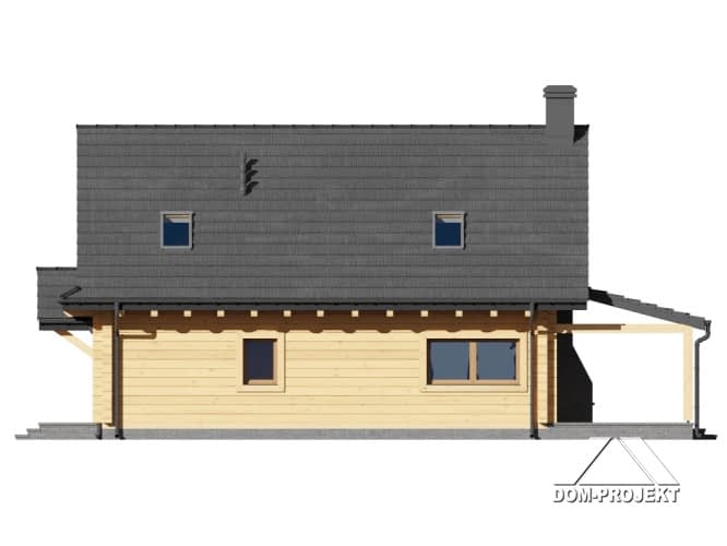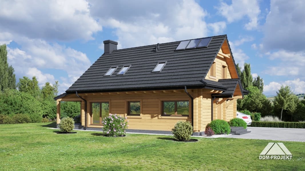 Dom z bali drewnianych. Na parterze duży salon z kuchnią, kominkiem, schodami na poddasze i wyjściem na zadaszony taras. Na tarasie kominek. Pokój, łazienka, pomieszczenie gospodarcze, wiatrołap, komunikacja. Na poddaszu cztery pokoje, łazienka i komunikacja. Zwarta bryła budynku i dach dwuspadowy sprzyjają szybkiej i taniej budowie i niskim kosztom eksploatacji.Rzuty