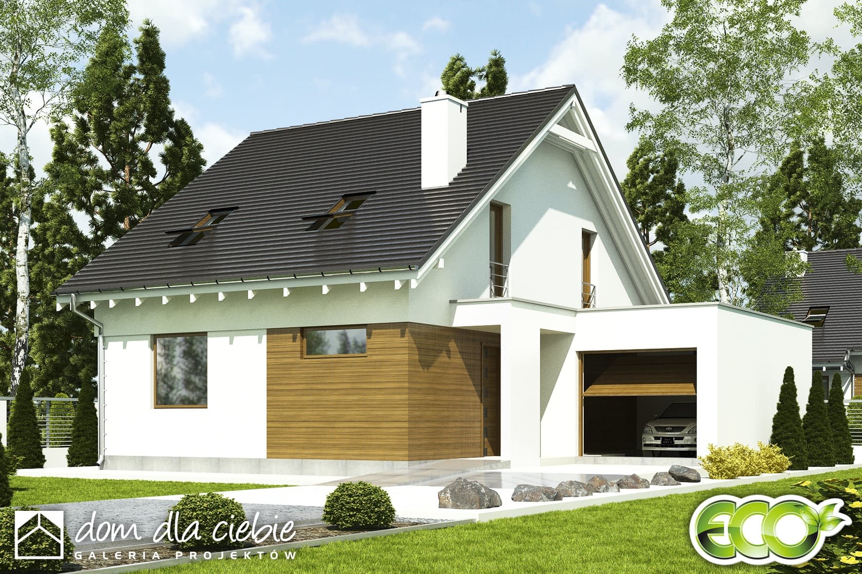 Projekt domu Głuszec jest przykładem klasycznego domu jednorodzinnego z poddaszem przeznaczonym na cele mieszkalne. Ten dwukondygnacyjny i prosty konstrukcyjnie dom jest dobrą alternatywą na wąskie działki lub do zabudowy bliźniaczej. do budynku prowadzi zadaszone wejście usytuowane z boku budynku. Połączono je z dużą wiatą przed domem. Na parterze zaproponowano strefę wspólną a także dodatkowy pokój mogacy pełnić funkcję gościnnego lub gabinetu. Z salonu z jadalnią i kuchnią można wyjść na taras i kominek. W kuchni znajdziemy spiżarnię a obok niej łazienkę. Dużą kotłownię zaprojektowano od frontu budynku.Na piętrze w projekcie zaproponowano trzy sypialnie, garderobę oraz duża łazienkę.Głuszec to dom ekonomiczny w budowie i eksploatacji. Ze względów ekonomicznych zrezygnowano z balkonów i tarasów. Zastosowane portfenetry i dodatkowo okna połaciowe sprawią, że każde pomieszczenie na poddaszu będzie doskonale doświetlone. Elewacę domu charakteryzuje delikatny detal i naturalna kolorystyka.