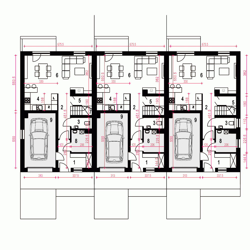 Opis odnosi się do pojedynczego segmentu. Projekt domu Głuszec III jest przykładem klasycznego domu jednorodzinnego z poddaszem przeznaczonym na cele mieszkalne. Ten dwukondygnacyjny i prosty konstrukcyjnie dom jest dobrą alternatywą na wąskie działki lub do zabudowy bliźniaczej. Do budynku prowadzi zadaszone wejście usytuowane z przodu budynku. Na parterze zaproponowano strefę wspólną. Z salonu z jadalnią i kuchnią można wyjść na taras. Pod schodami znajdziemy spiżarnię. Obok schodów zaprojektowano niewielkie WC. Dużą kotłownię jest dostępna z wiatrołapu podobnie jak i garaż.Na piętrze w projekcie zaproponowano trzy sypialnię, łazienkę i pralnię. Jedna z sypialni to duży a przestrzeń typu master bedroom.Głuszec III to dom ekonomiczny w budowie i eksploatacji. Ze względów ekonomicznych zrezygnowano z balkonów i tarasów. Zastosowane portfenetry i dodatkowo okna połaciowe sprawią, że każde pomieszczenie na poddaszu będzie doskonale doświetlone. Elewację domu charakteryzuje delikatny detal i naturalna kolorystyka.