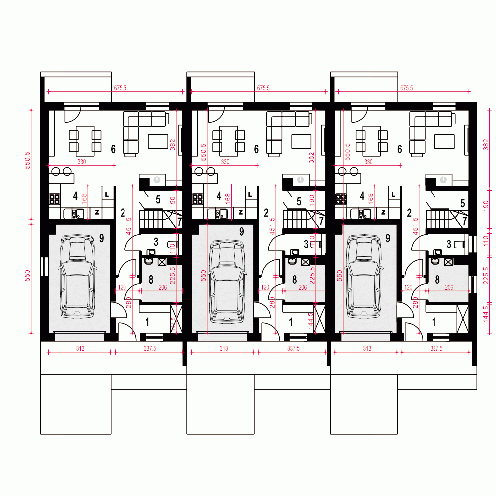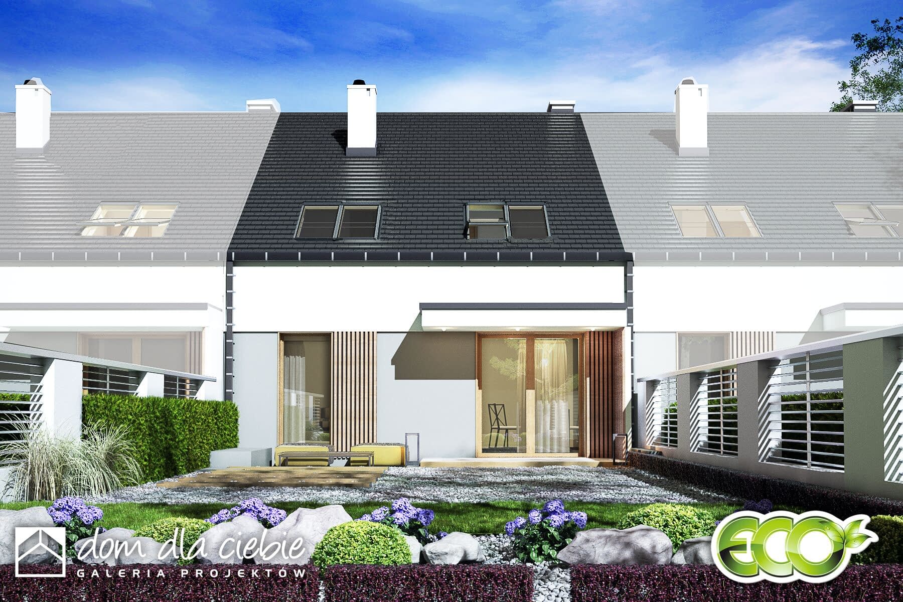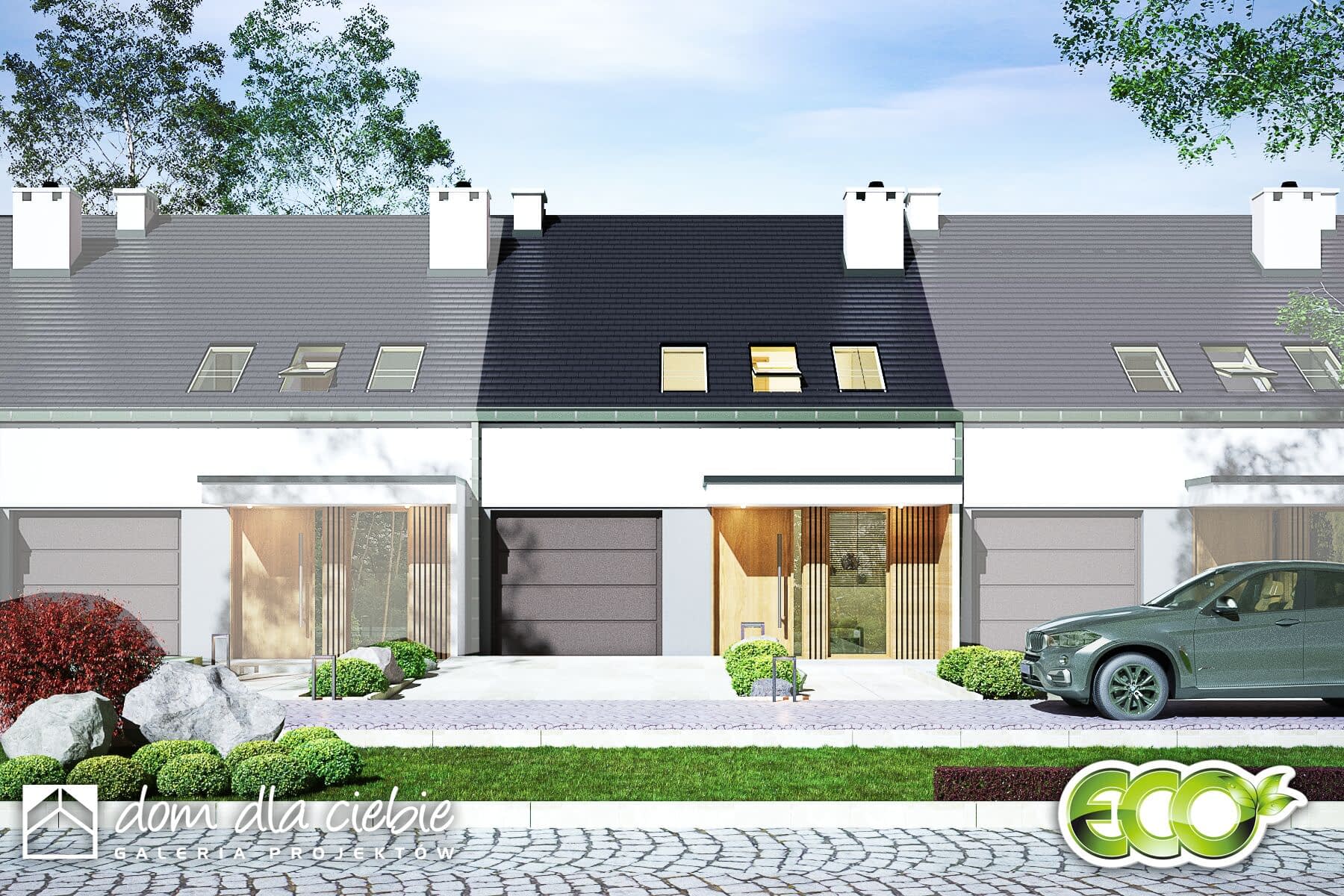 Opis odnosi się do pojedynczego segmentu. Projekt domu Głuszec III Mode jest przykładem klasycznego domu jednorodzinnego z poddaszem przeznaczonym na cele mieszkalne. Ten dwukondygnacyjny i prosty konstrukcyjnie dom jest dobrą alternatywą na wąskie działki lub do zabudowy bliźniaczej. Do budynku prowadzi zadaszone wejście usytuowane z przodu budynku. Na parterze zaproponowano strefę wspólną. Z salonu z jadalnią i kuchnią można wyjść na taras. Pod schodami znajdziemy spiżarnię. Obok schodów zaprojektowano niewielkie WC. Dużą kotłownię jest dostępna z wiatrołapu podobnie jak i garaż.Na piętrze w projekcie zaproponowano trzy sypialnię, łazienkę i pralnię. Jedna z sypialni to duży a przestrzeń typu master bedroom.Głuszec III Mode to dom ekonomiczny w budowie i eksploatacji. Ze względów ekonomicznych zrezygnowano z balkonów i tarasów. Zastosowane portfenetry i dodatkowo okna połaciowe sprawią, że każde pomieszczenie na poddaszu będzie doskonale doświetlone. Elewację domu charakteryzuje delikatny detal i naturalna kolorystyka.