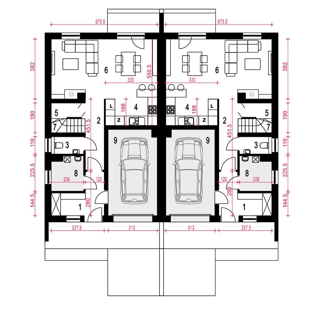 Opis odnosi się do pojedynczego segmentu. Projekt domu Głuszec III Mode jest przykładem klasycznego domu jednorodzinnego z poddaszem przeznaczonym na cele mieszkalne. Ten dwukondygnacyjny i prosty konstrukcyjnie dom jest dobrą alternatywą na wąskie działki lub do zabudowy bliźniaczej. Do budynku prowadzi zadaszone wejście usytuowane z przodu budynku. Na parterze zaproponowano strefę wspólną. Z salonu z jadalnią i kuchnią można wyjść na taras. Pod schodami znajdziemy spiżarnię. Obok schodów zaprojektowano niewielkie WC. Dużą kotłownię jest dostępna z wiatrołapu podobnie jak i garaż.Na piętrze w projekcie zaproponowano trzy sypialnię, łazienkę i pralnię. Jedna z sypialni to duży a przestrzeń typu master bedroom.Głuszec III Mode to dom ekonomiczny w budowie i eksploatacji. Ze względów ekonomicznych zrezygnowano z balkonów i tarasów. Zastosowane portfenetry i dodatkowo okna połaciowe sprawią, że każde pomieszczenie na poddaszu będzie doskonale doświetlone. Elewację domu charakteryzuje delikatny detal i naturalna kolorystyka.