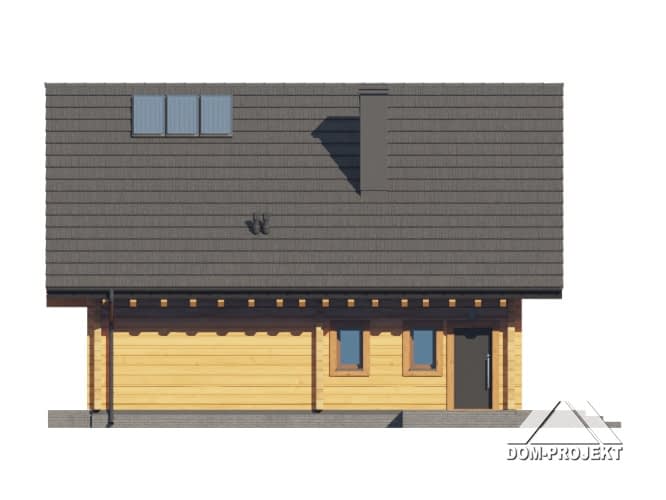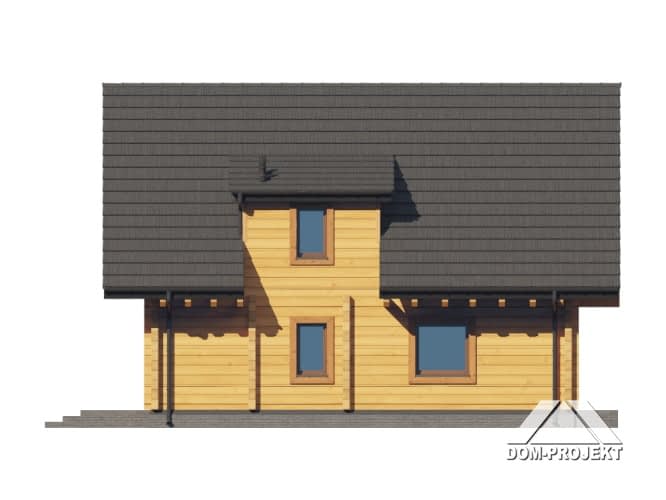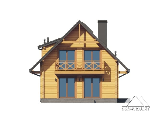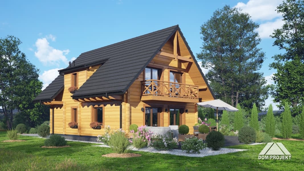 Dom z bali. na parterze salon z aneksem kuchennym oraz wyjściem na taras. Łazienka, kotłownia, spiżarka, wiatrołap, komunikacja. Na poddaszu trzy pokoje, garderoba, łazienka, komunikacja. Zwarta bryła budynku oraz dach dwuspadowy sprzyjają szybkiej i taniej budowie oraz niskim kosztom eksploatacji.Rzuty