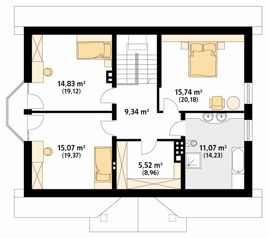 - rzuty poziome poszczególnych kondygnacji (parter, poddasze lub piętro),