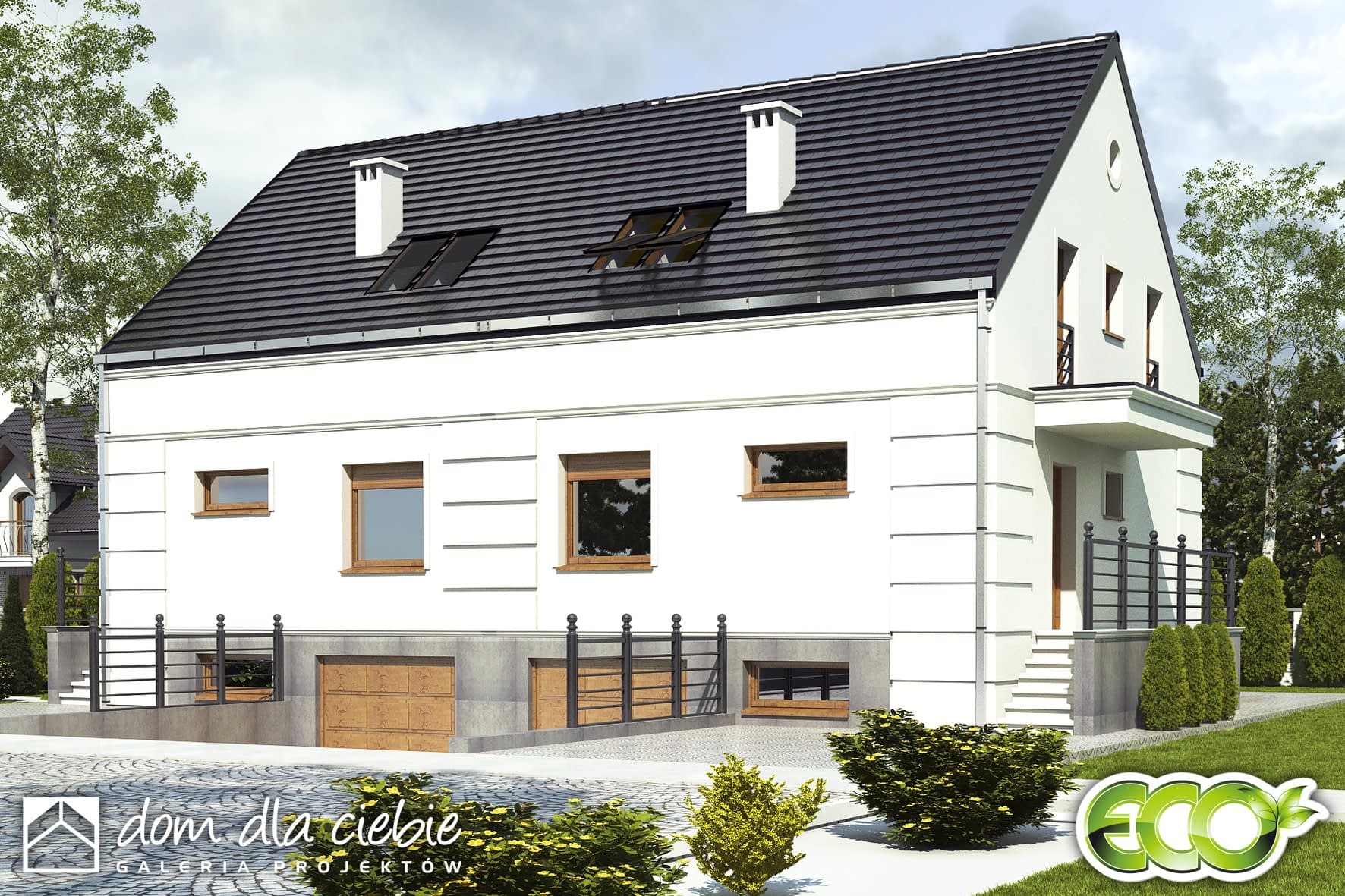 (Uwaga: projekty typu bliźniak oferujemy jako domy dwulokalowe, projekt można zamówić również w zabudowie bliźniaczej)Grab w zabudowie dwulokalowej to połączone segmenty w odbiciach lustrzanych, od strony garaży, z jedną wspólną ścianą gr 25 cm. Opis poniżej odnosi się do jednego segmentu.Grab jest propozycją niedużego domu jednorodzinnego utrzymanego w klasycznej stylistyce. Przeznaczony jest szczególnie dla wąskich działek miejskich i podmiejskich oraz do zabudowy bliźniaczej.Projekt przewiduje wbudowany garaż oraz pomieszczenia pomocnicze takie jak kotłownia oraz spiżarnia w piwnicy.Projekt przewidziano dla potrzeb 4-5 osobowej rodziny. Na parterze mamy ustawny i połączony z kuchnią i jadalnią salonu a także dodatkowy pokój, niewielką łazienkę oraz duży wiatrołap z garderobą.Na piętrze zaprojektowano trzy sypialnie oraz łazienkę. Biały kolor na elewacji zarówno w detalu jak i na płaskich powierzchniach oraz niewielki dodatek szarości podkreśla elegancki charakter budynku.Jedną z wielu zalet projektu Grab jest maksymalnie uproszczona konstrukcja oraz prosta bryła, co powoduje, że Grab będzie domem tanim w budowie i eksploatacji.
