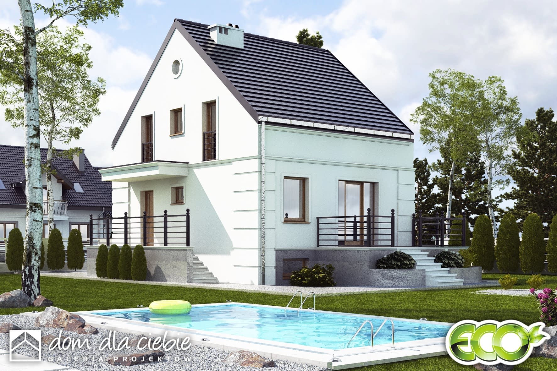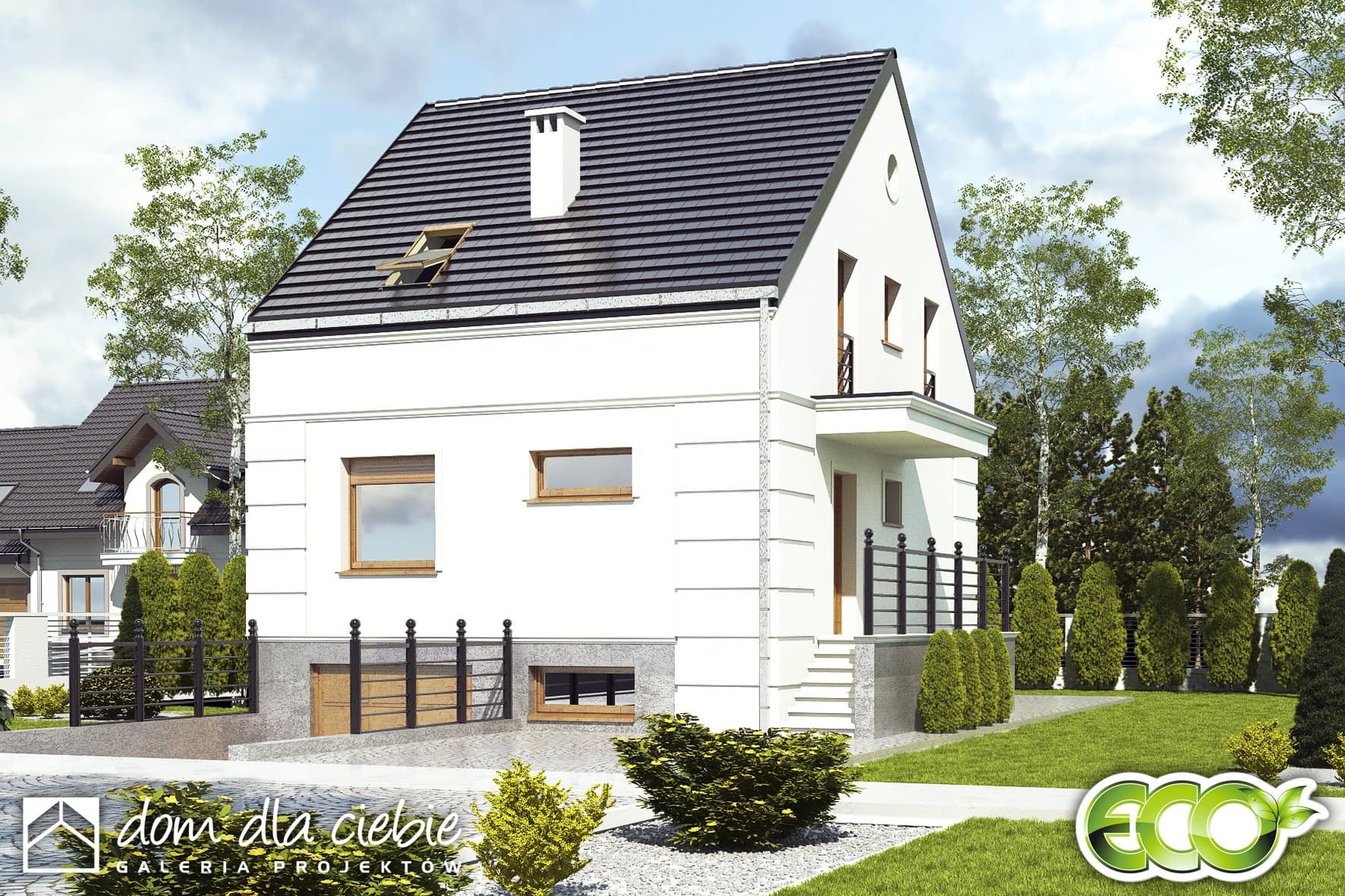 Grab jest propozycją niedużego domu jednorodzinnego utrzymanego w klasycznej stylistyce. Przeznaczony jest szczególnie dla wąskich działek miejskich i podmiejskich oraz do zabudowy bliźniaczej.Projekt przewiduje wbudowany garaż oraz pomieszczenia pomocnicze takie jak kotłownia oraz spiżarnia w piwnicy.Projekt przewidziano dla potrzeb 4-5 osobowej rodziny. Na parterze mamy ustawny i połączony z kuchnią i jadalnią salonu a także dodatkowy pokój, niewielką łazienkę oraz duży wiatrołap z garderobą.Na piętrze zaprojektowano trzy sypialnie oraz łazienkę. Biały kolor na elewacji zarówno w detalu jak i na płaskich powierzchniach oraz niewielki dodatek szarości podkreśla elegancki charakter budynku.Jedną z wielu zalet projektu Grab jest maksymalnie uproszczona konstrukcja oraz prosta bryła, co powoduje, że Grab będzie domem tanim w budowie i eksploatacji.