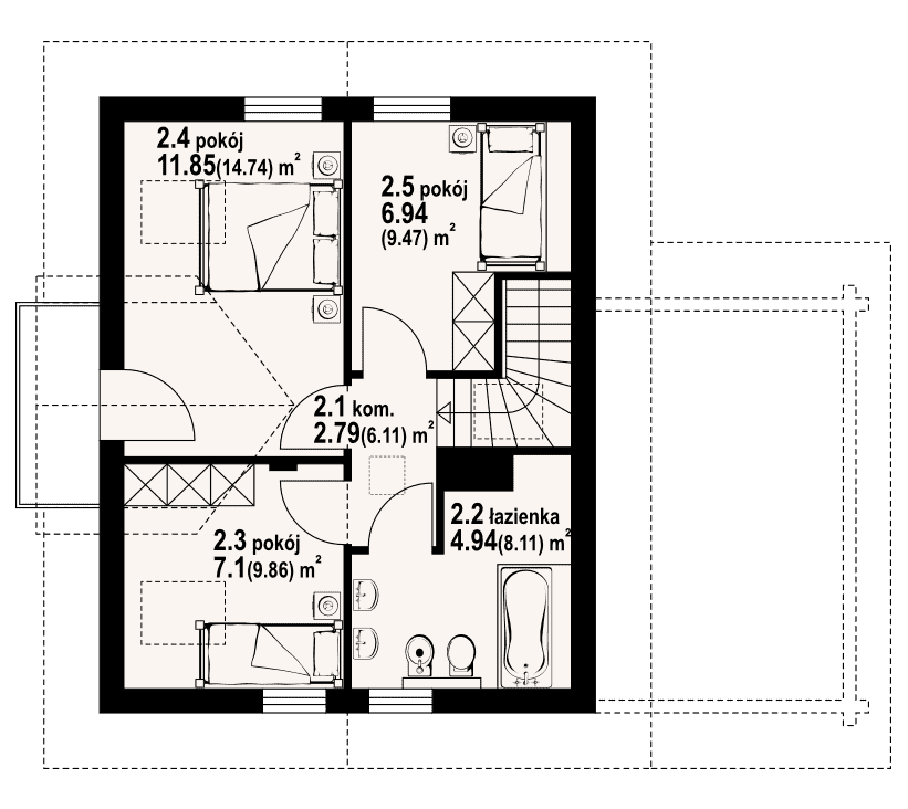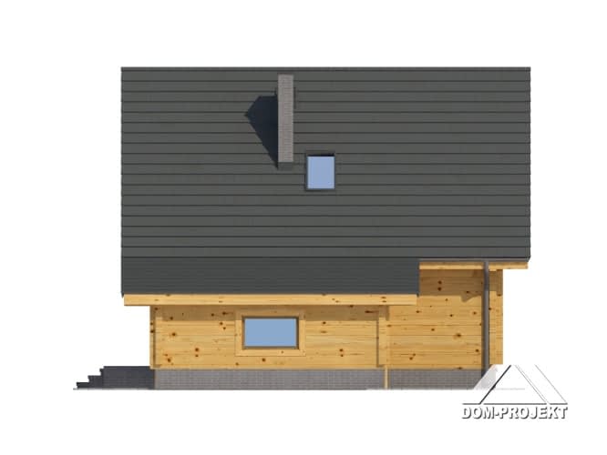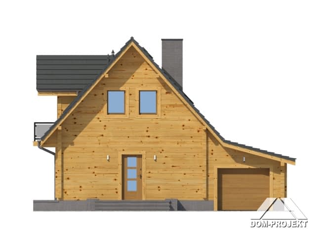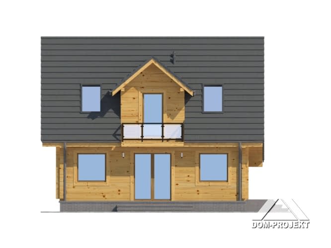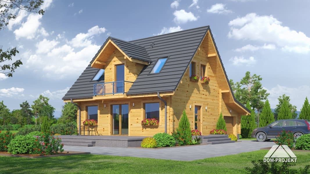 Dom w konstrukcji szkieletu drewnianego. Duży salon z aneksem kuchennym, kominkiem, wyjściem na taras i schodami na poddasze. Wiatrołap, wc z pralką i garaż. Na poddaszu trzy pokoje, łazienka, komunikacja, balkon. Zwarta bryła budynku i dach dwuspadowy sprzyjają taniej i szybkiej budowie i niskim kosztom eksploatacji.Rzuty